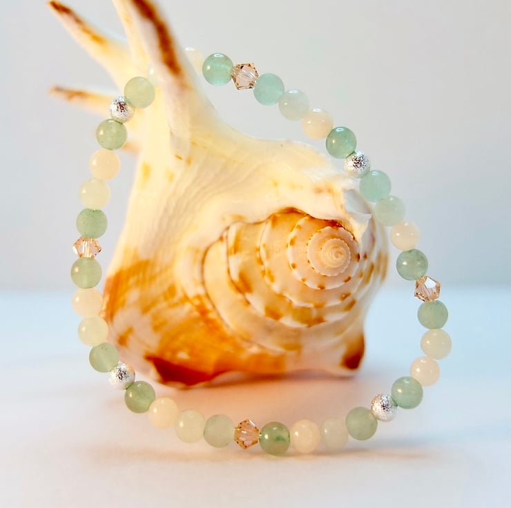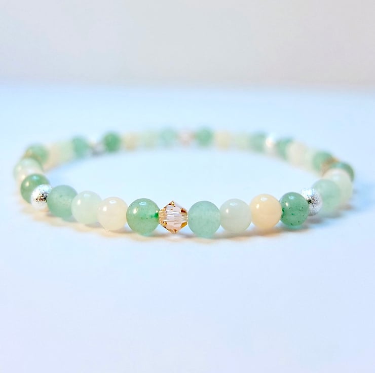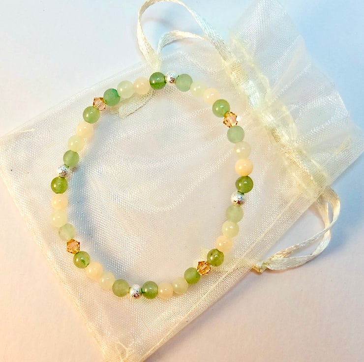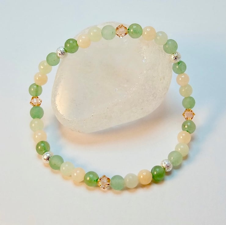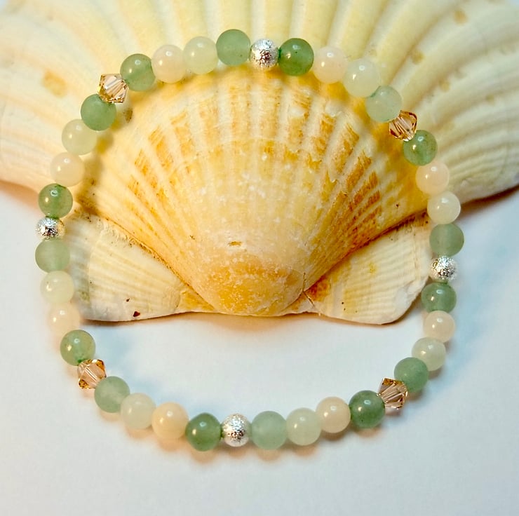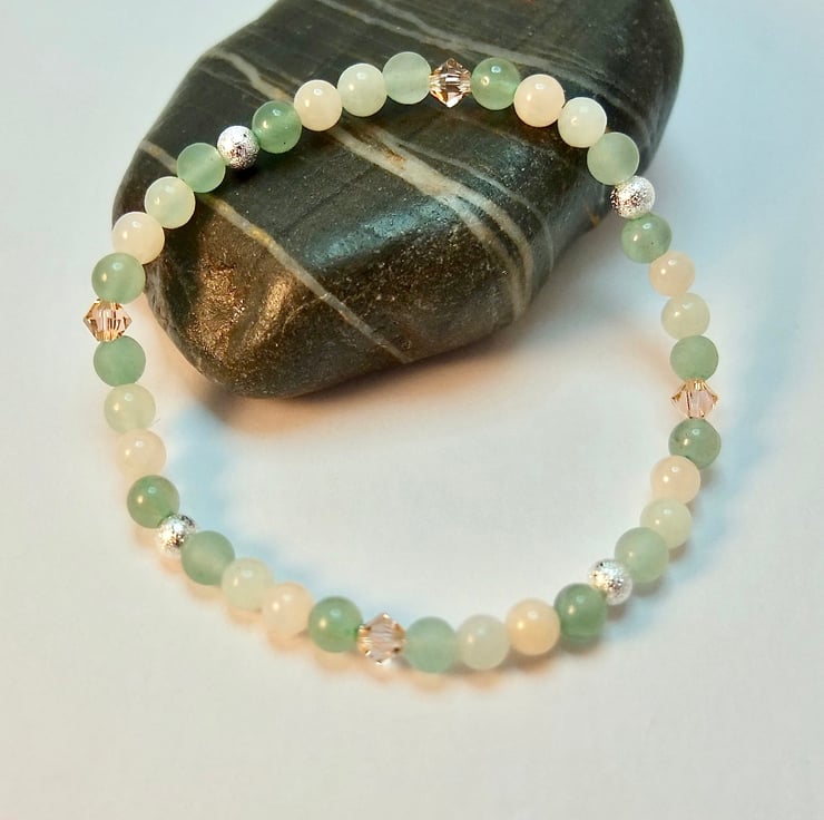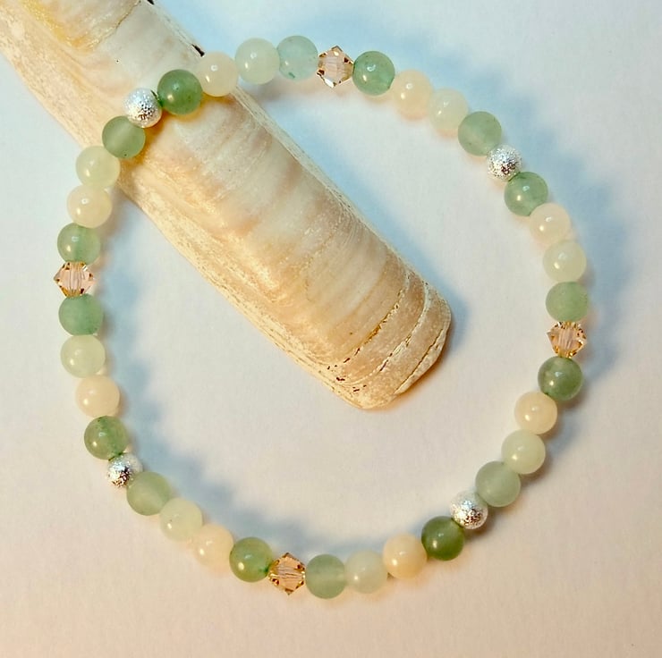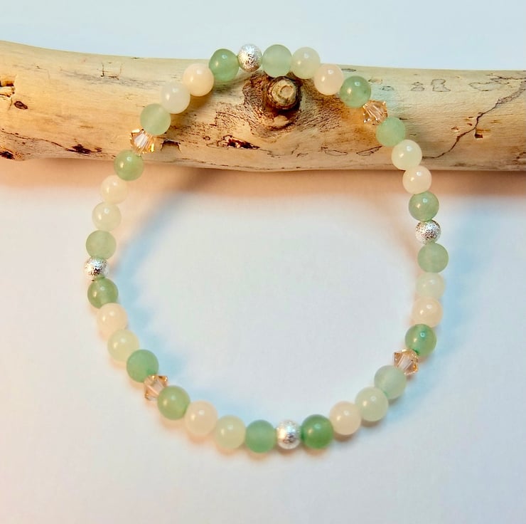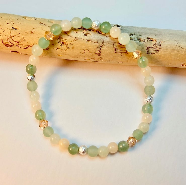 Pretty, dainty bracelet featuring 4mm beads of smooth and frosted green Aventurine, New Jade and pale peach Mashan Jade.