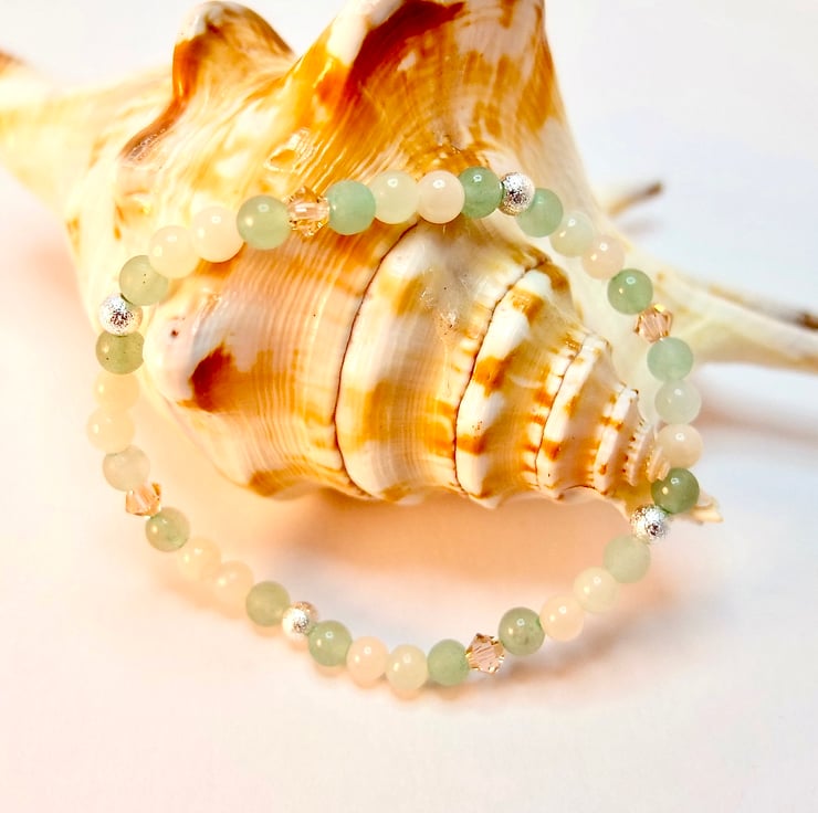 The green Aventurine beads are a lovely sage green colour, the Mashan Jade beads (the trade name for dolomite Marble) are a very pale peach colour, a shade lighter than the Swarovski crystals, and the New Jade beads (actually a type of Serpentine) are a very pale 'celery heart' green.