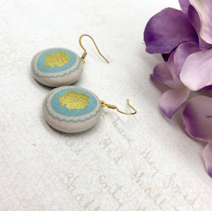 I then added a circle of FSC approved birch plywood in the back recess of the button and hand painted them with an aqua metallic artist acrylic paint. After two coats of this luscious paint, I added two layers of clear acrylic varnish. Then, gold plated plated leaf shaped earring bails were secured to the back of each earring and Stainless steel gold plated earring hooks with scroll detail. Stainless steel is hypoallergenic, so is perfect for sensitive skin.