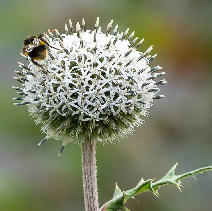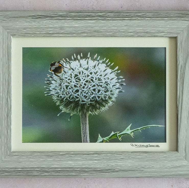 This original framed photo is of a bee collecting nectar from the flower of a thistle. I took the photo in my back garden.