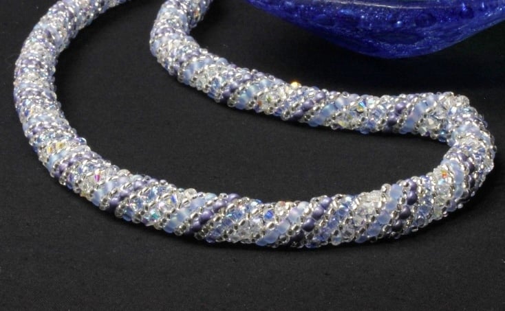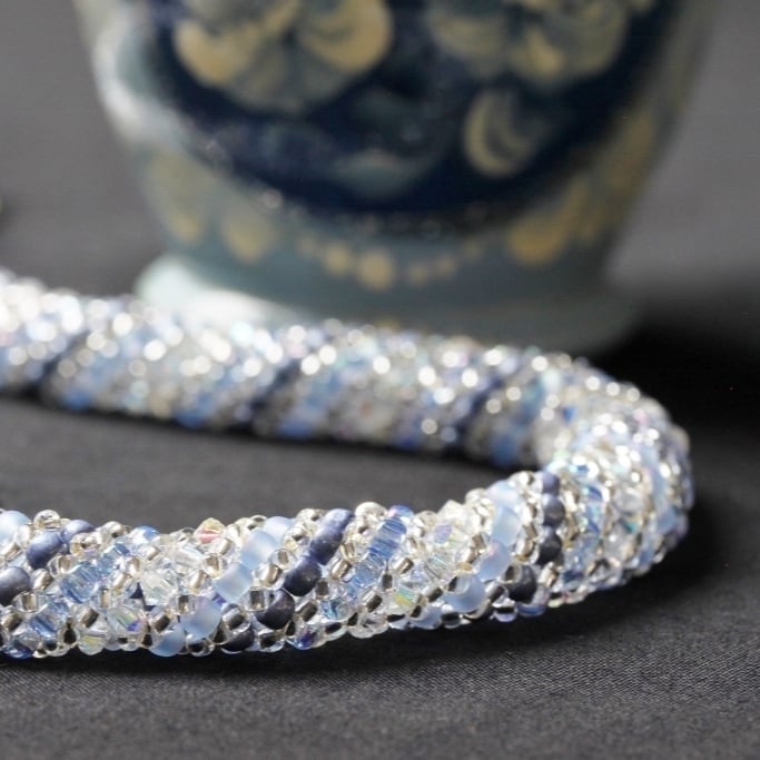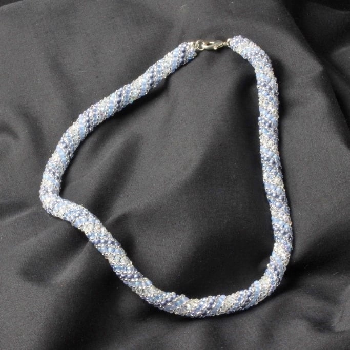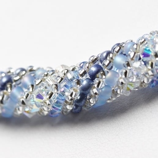 A sparkly spiral necklace, ideal to wear for an evening out. It would also look lovely on a bridesmaid. Little silver seed beads have been woven between slightly larger beads in shades of blue: frosty blue, pearly blue and shiny transparent blue. Between the blue is a spiral of clear bicone Preciosa crystals with an AB coating that makes the piece glitter as it catches the light.