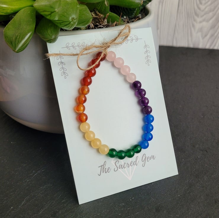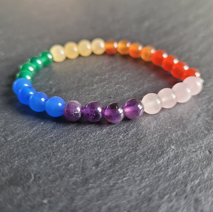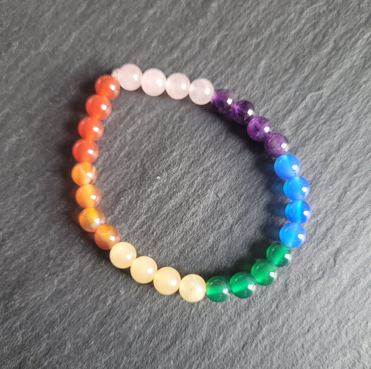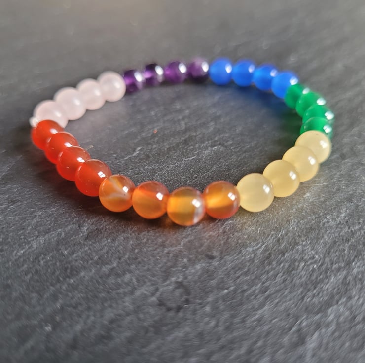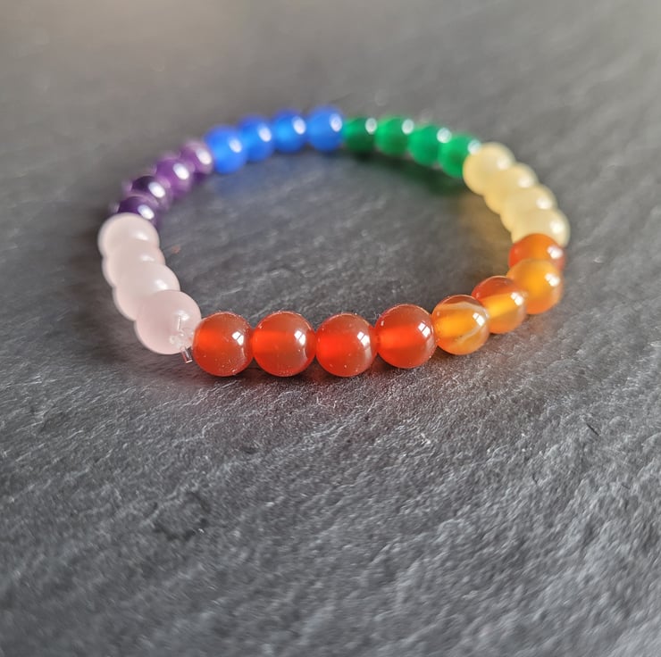 It is made with 6mm round red and orange carnelian, ambronite, green agate, blue onyx, amethyst and rose quartz. The gemstones are threaded onto high quality elastic so the bracelet is super quick and easy to put on and off. A dab of superglue has been added to the knot to keep it secure. The inside diameter of the bracelet (when unstretched) measures approximately 15cm/6".