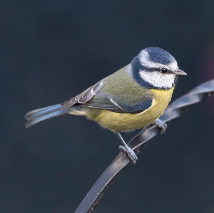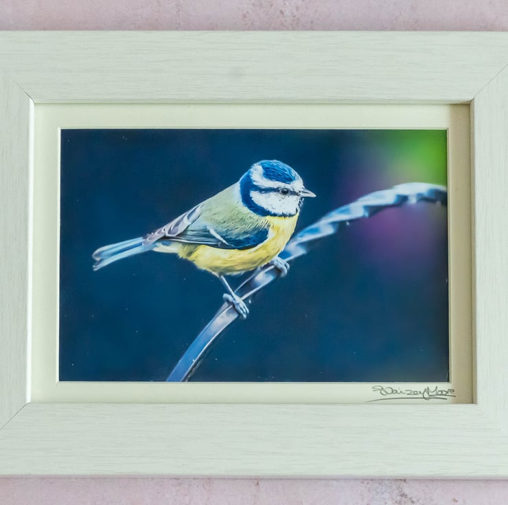 Original photo of a beautifully coloured Blue Tit sitting on top of a metal bird feeding station. I took this photo in my garden in Buckinghamshire on 04.10.21.