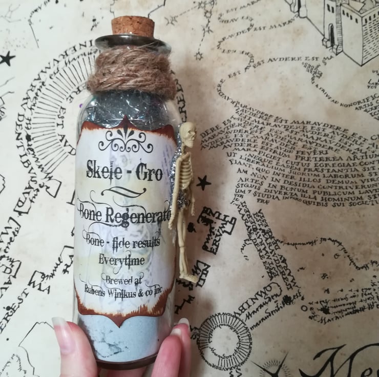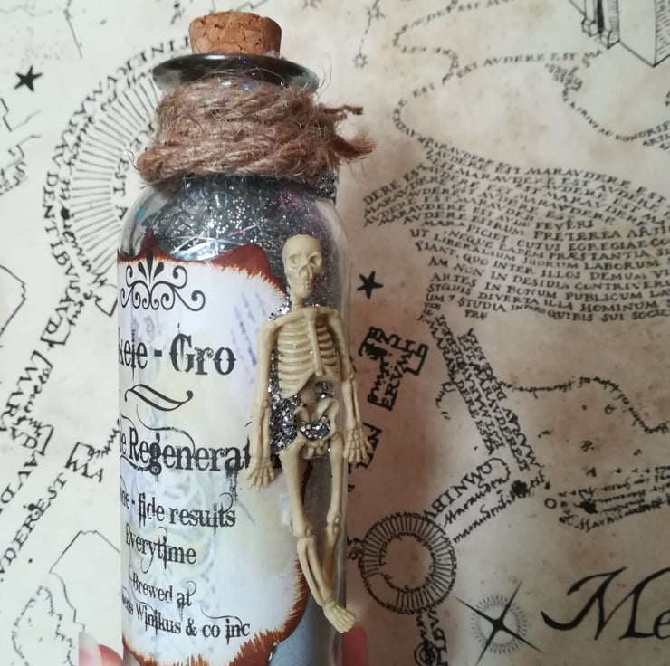 This beautiful replica Skele-gro glass potion bottle measures 7 inches.
