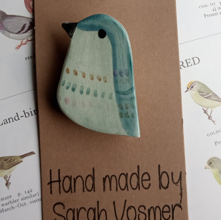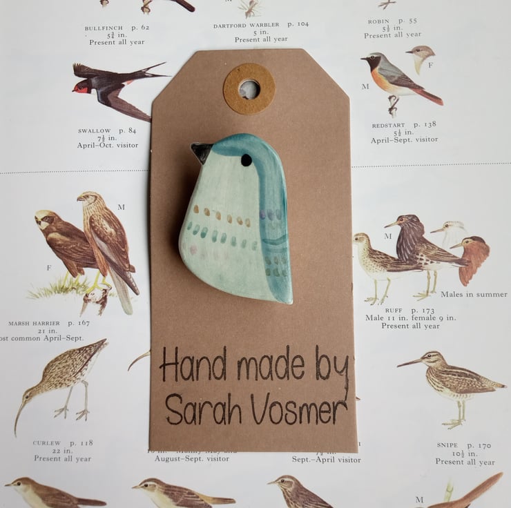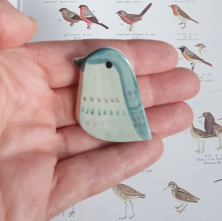 This is a lovely range of bird brooches, all glazed slightly differently, whilst showing a quirky little character bird. I use a white clay, so the colours I use are vivid and have a hand painted quality about them. The bird is approximately 3.5 cm x 4cm.