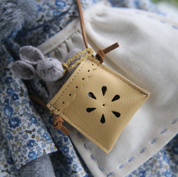 Her accessories include a tiny leather bag, hand punched with a daisy design and containing a baby bunny with a ric rac tie.