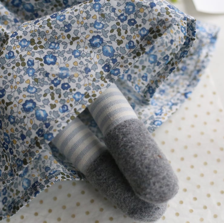 Her body is constructed from grey wool fabric.