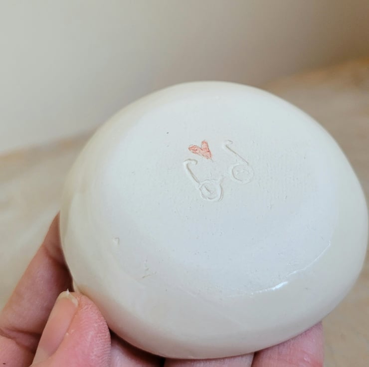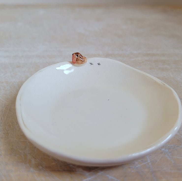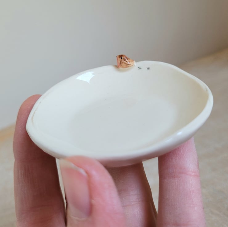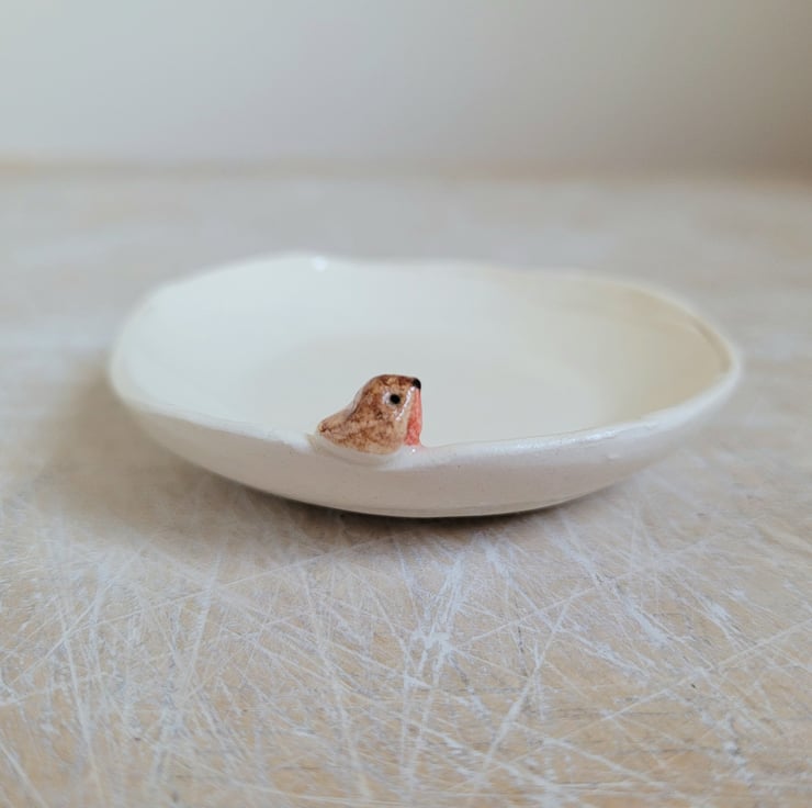 Hand thrown little pot from a small ball of clay . Once trimmed and the tiniest of handmade robins was attached and bird prints added prior to bisque firing . The robin was then hand painted and the little dish was dipped in clear lead free glaze prior to the final firing