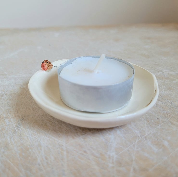Pottery tea light candle holder. There is a tiny hand modelled and painted robin perched on the side and little footprints in white clay and clear shiny glaze .