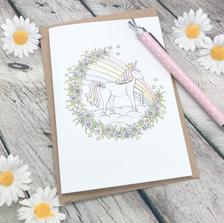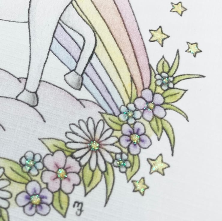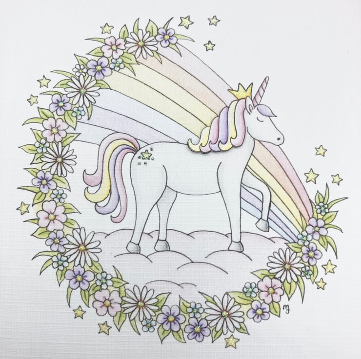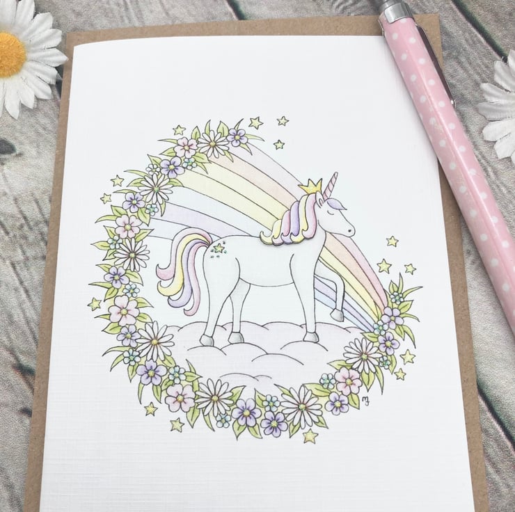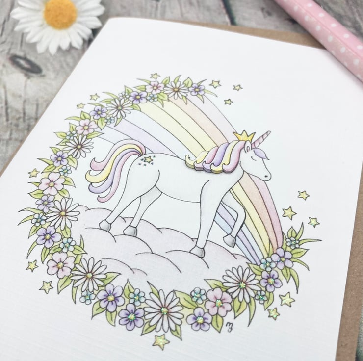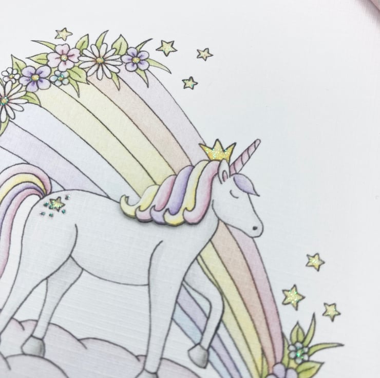This pretty floral unicorn card has been designed using my own original illustration. The image has been printed out onto good quality white linen embossed card and decoupaged up in parts. I have also added a little glitter detail.