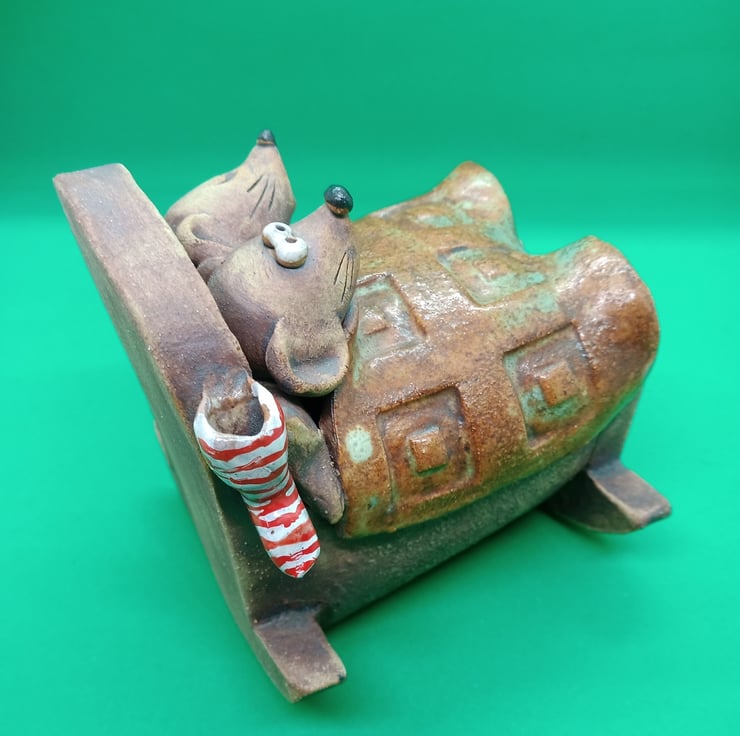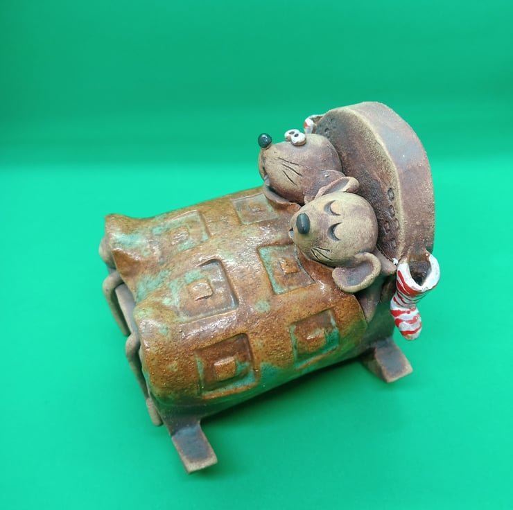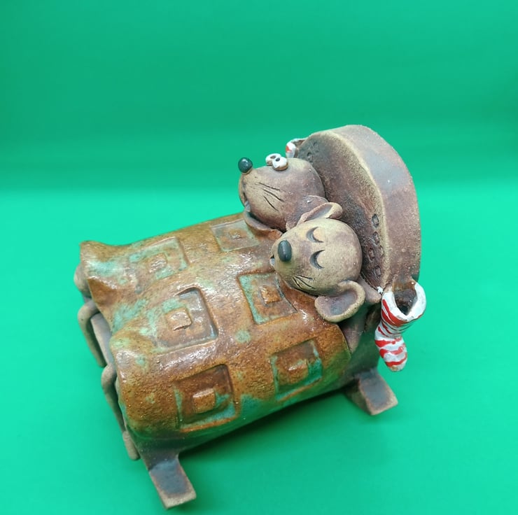 Two little mice tucked up in bed waiting for Santa to come and fill their stockings with cheese. A great ornament for mice lovers and looks good all year round too. Handmade in stoneware clay glazed in natural shades of brown and cream.