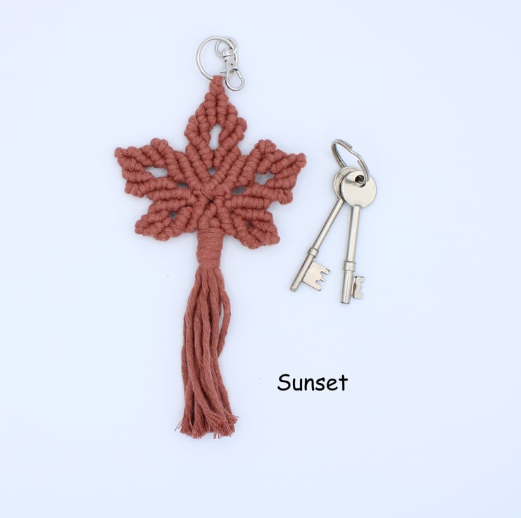 Accessorise your bag or brighten up your keys. My own design of the maple leaf has been used to create these handmade macramé keyrings.