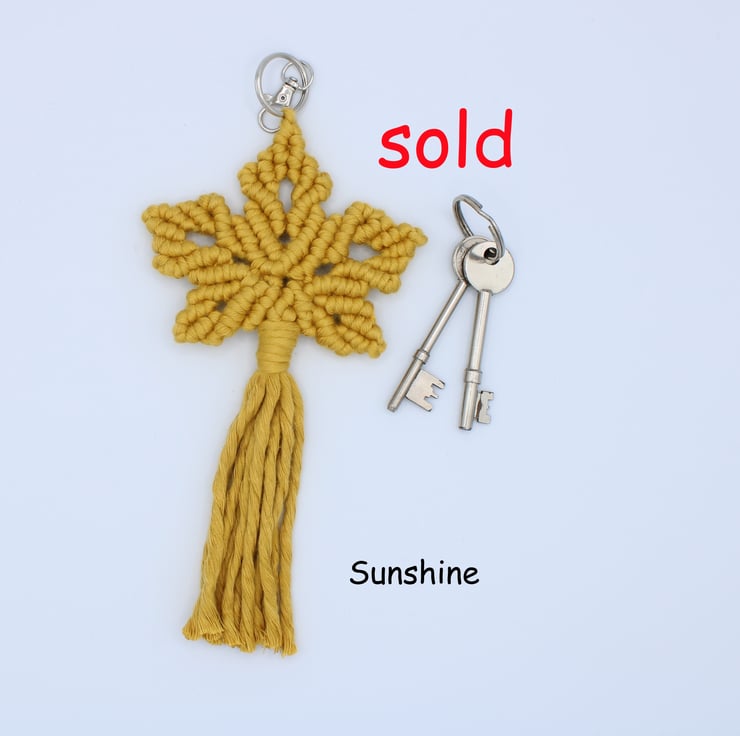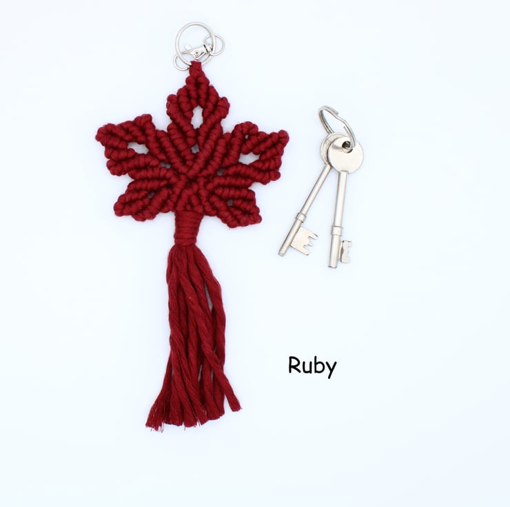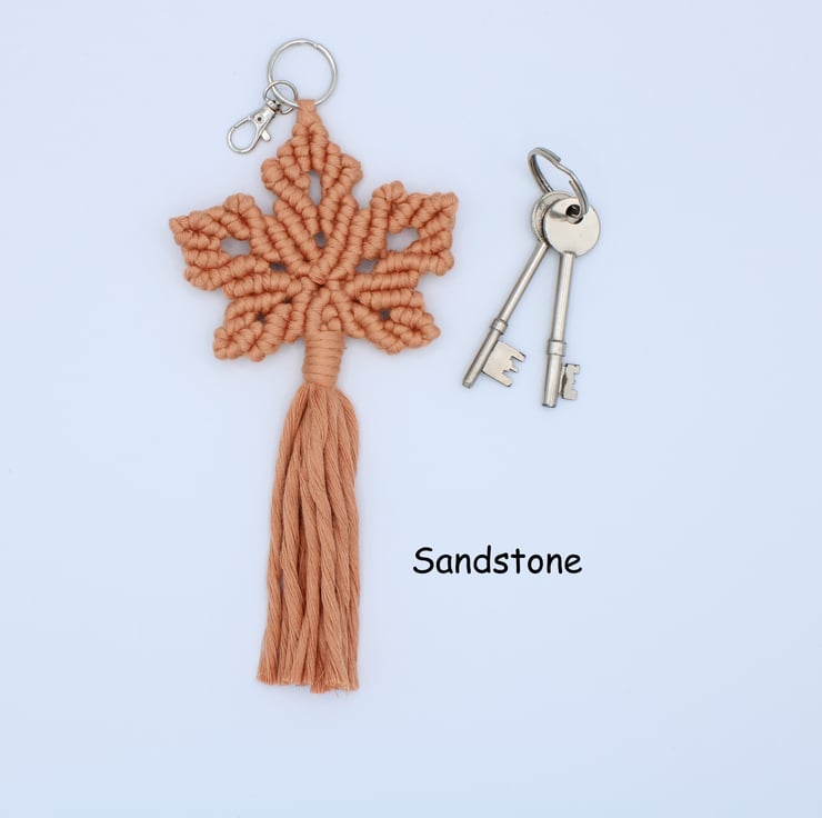 Maple leaf macramé keyring handmade to my own design. These keyrings have been and knotted with bamboo string which is super soft and gives them a shiny lustre.
