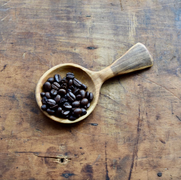 A hand carved wooden scoop made from silver birch with a light ebonising detail on the handle. The spoon measures approximately 14cm in length and the widest part of the bowl measures 6.5cm.