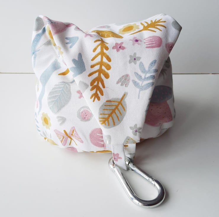 When your peg bag has done its job, it needs storing away. This unique peg bag keeps your pegs safe inside. Just flip over the top and clip the carabiner into the loop at the back.