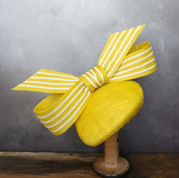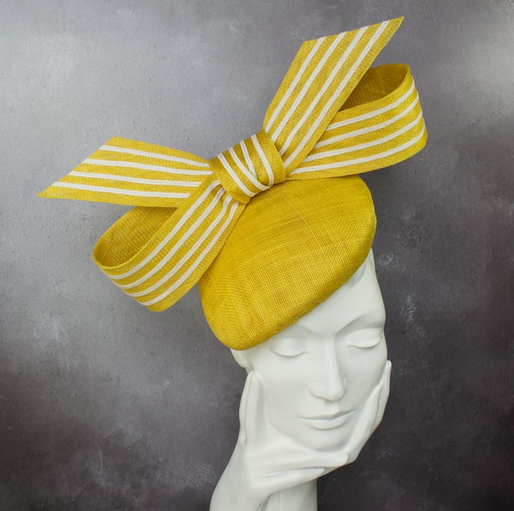 BOBBY is a beautifully crafted sinamay (straw) percher hat with oversized striped bow trim suitable for weddings, racing events and formal occasions.