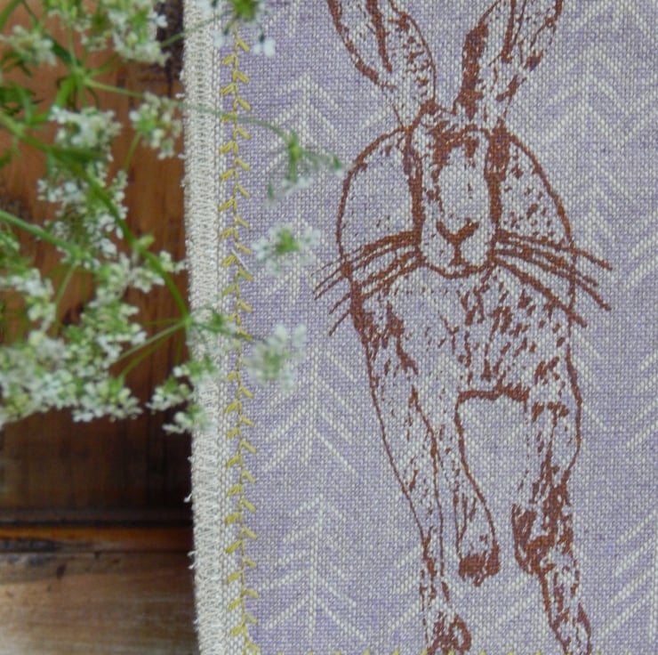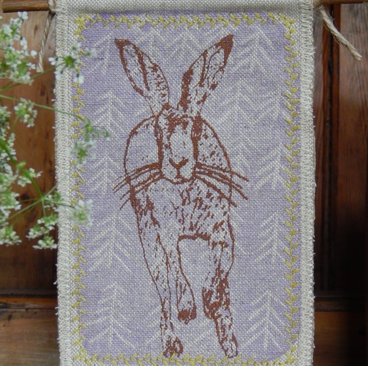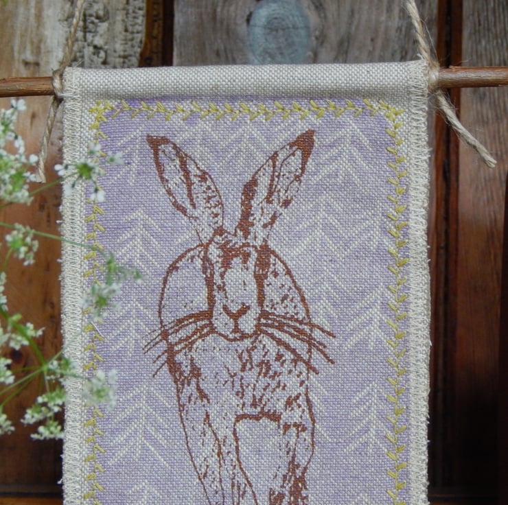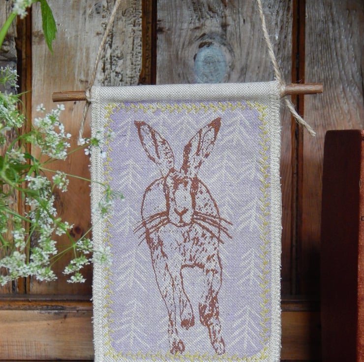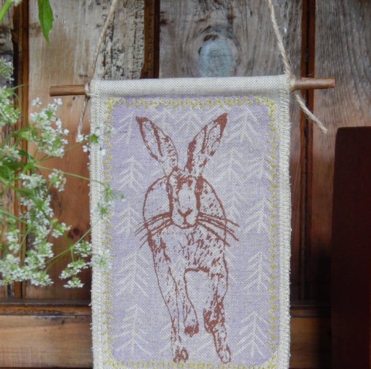 This is a screen printed Hare on a simple mauve lino print background. This has a couple of layers of cotton fabric for some stability and this is sewn onto a piece of willow, a simple hanging loop is made with a piece of hemp string connected from one end of the willow to the other.