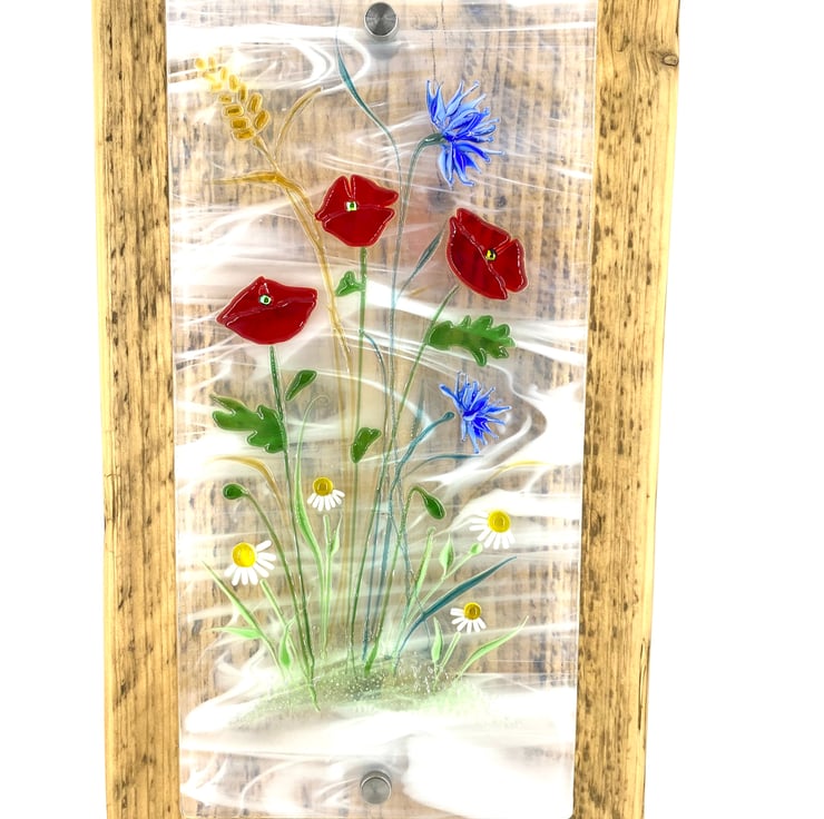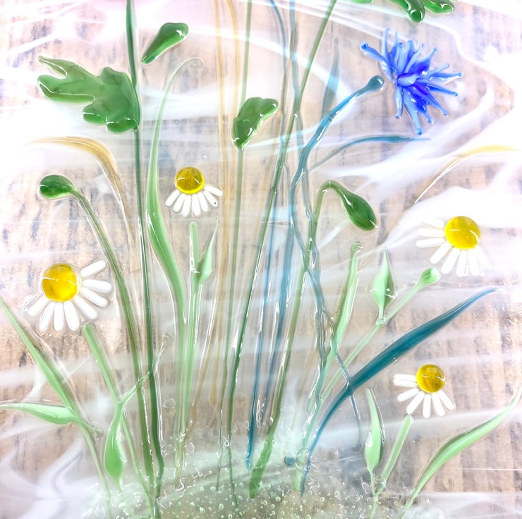 An array of delicate wild flowers on wispy white glass. A mix of poppies, daisies and cornflowers nestled amongst golden wheat. The fine stems & leaves have been created using my lamp work torch which allows me to work with the glass whilst molten and manipulate into shape.