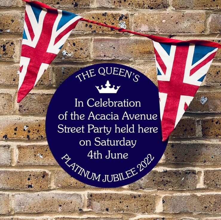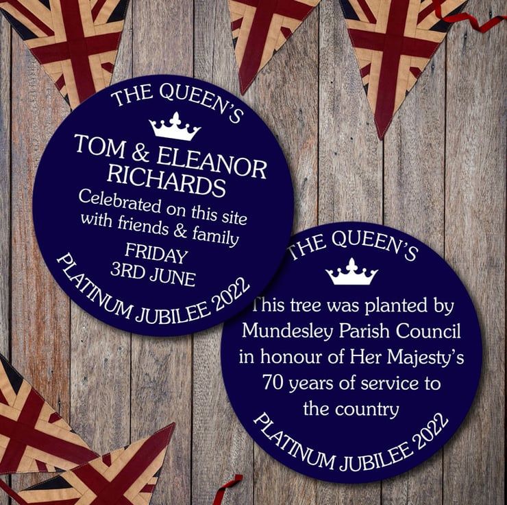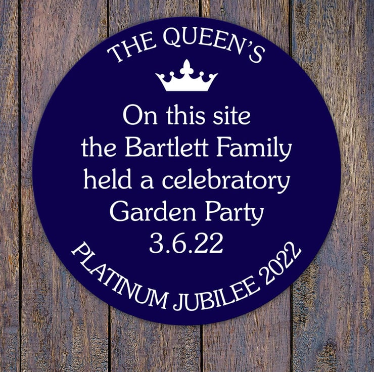 Because this plaque is created from strong 3mm blue acrylic it will last for years and can be happily displayed both outdoors or inside. The plaque features the words “The Queen’s” around the top curve, and “Platinum Jubilee 2022” around the bottom curve - but the rest of the wording is entirely up to you! You have space for around 5-6 lines of text. (See the examples shown here for a guide to the amount of wording and length of text that will fit. I try not to specify an exact word count, but please don’t try to add too much wording – short and sweet has much more impact!)