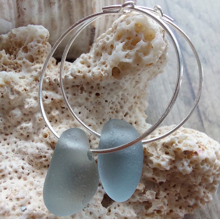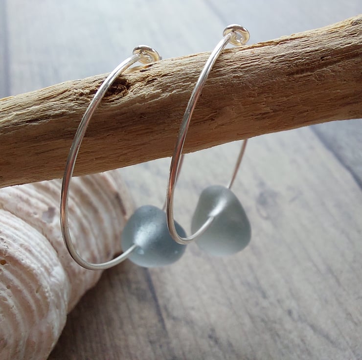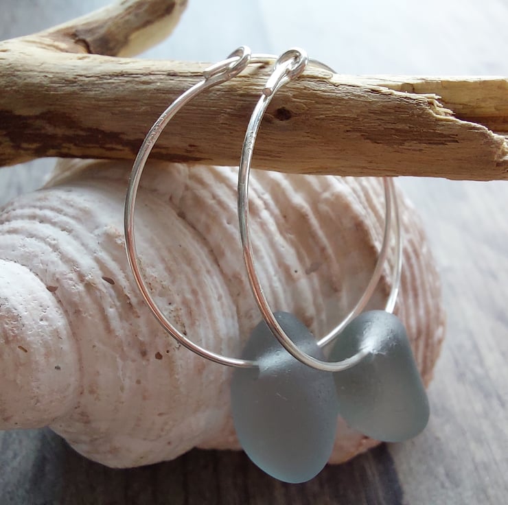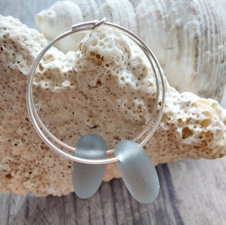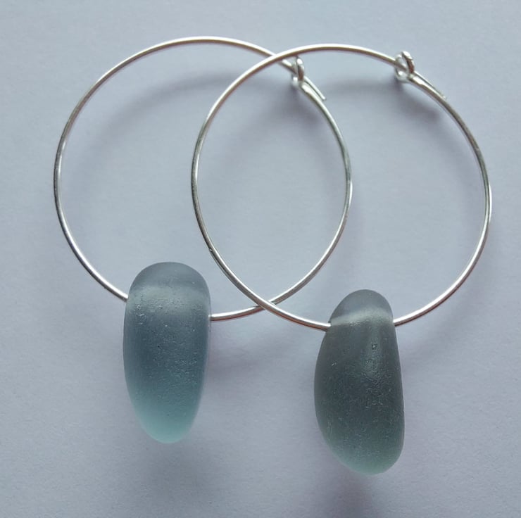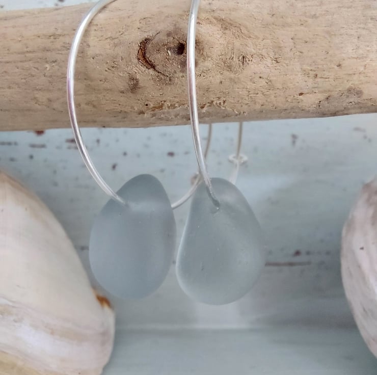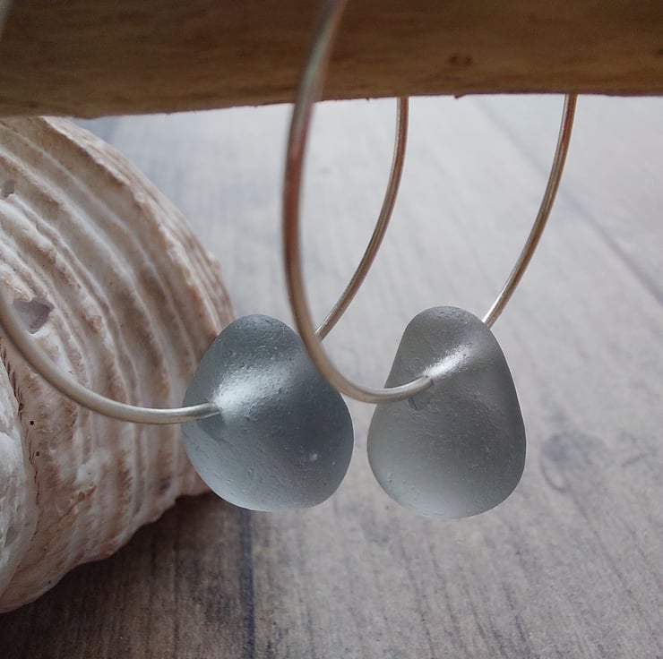 A lovely example of genuine Seaham 'grey' pieces drilled to make a simply elegant pair of earrings. The glass has been collected from the beach at Seaham and is presented on a pair of sterling silver 2.5cm hoops. These are unique unique and beautiful earrings that would make a wonderful gift.