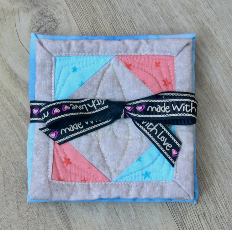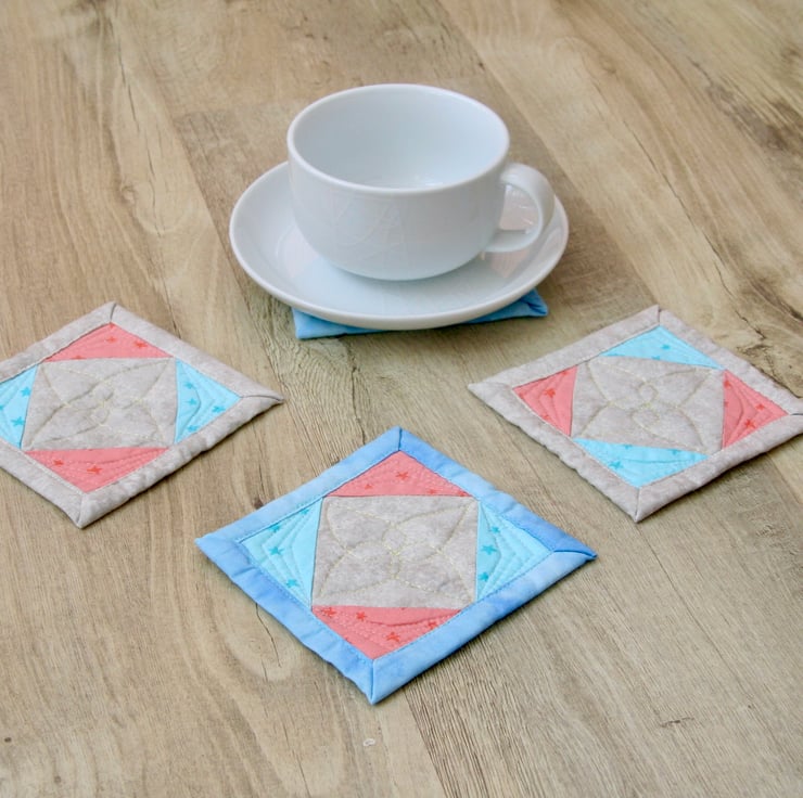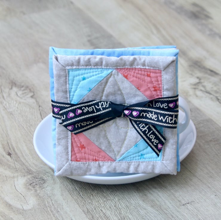 This set of four quilted coasters featuring small stars on pink and blue background with a plain pale grey centre, are perfect for adding some spring style to your drinks.