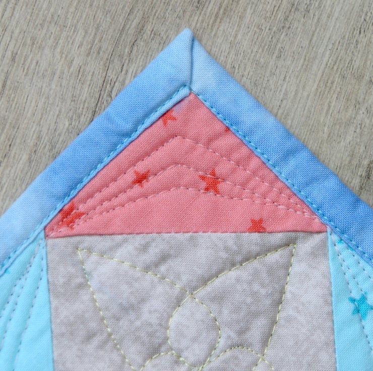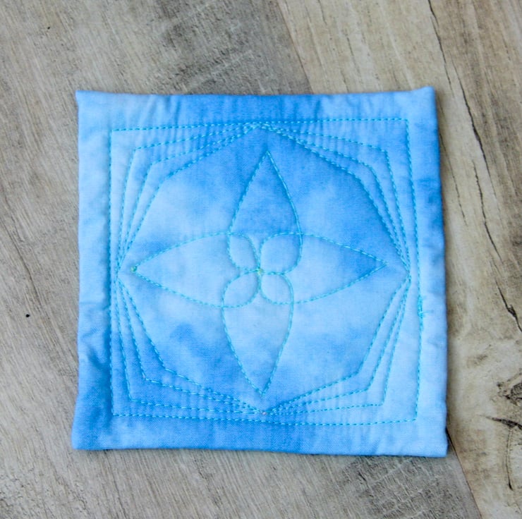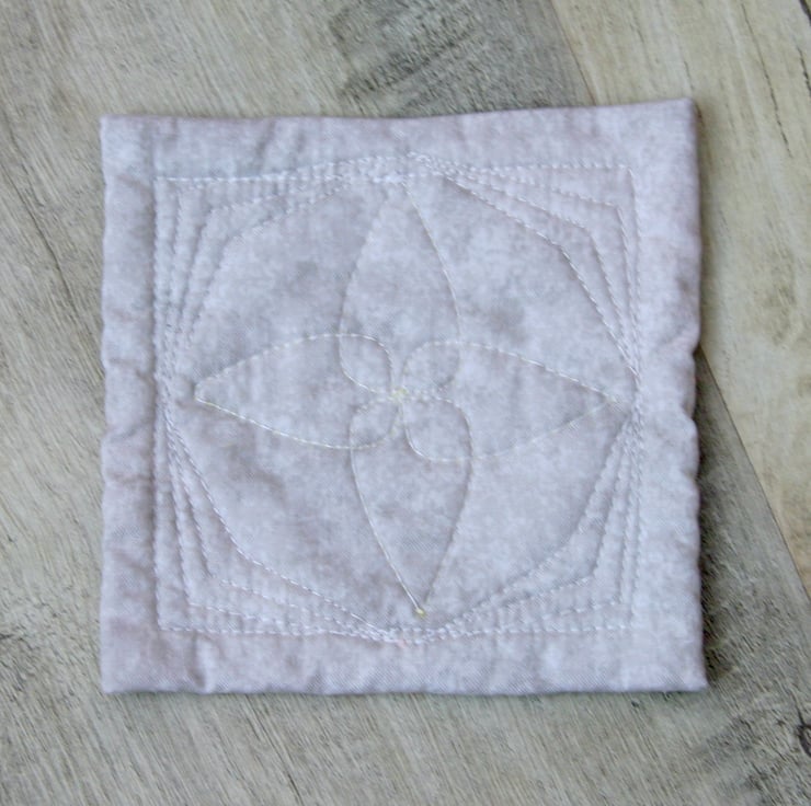 The coasters are quilted using free-motion quilting with petal design in the central diamond.