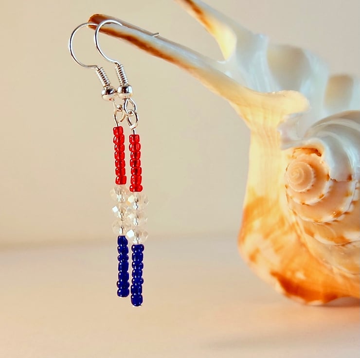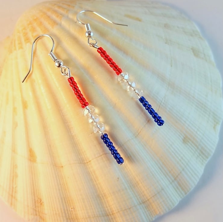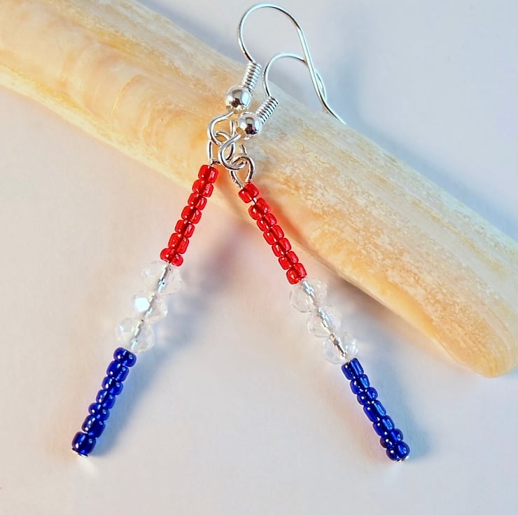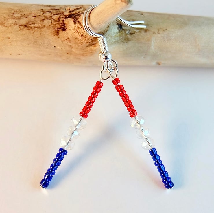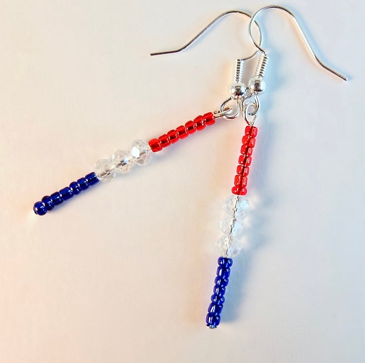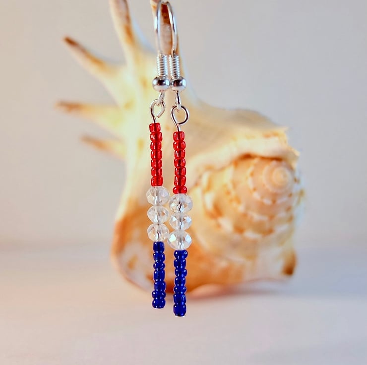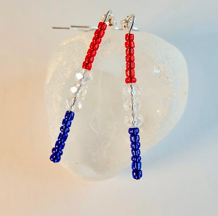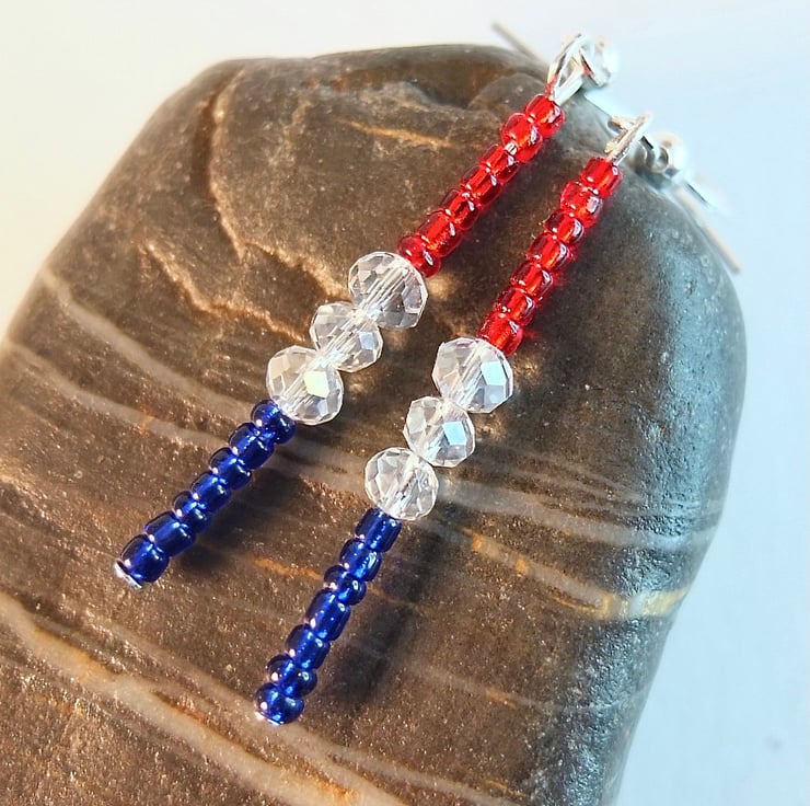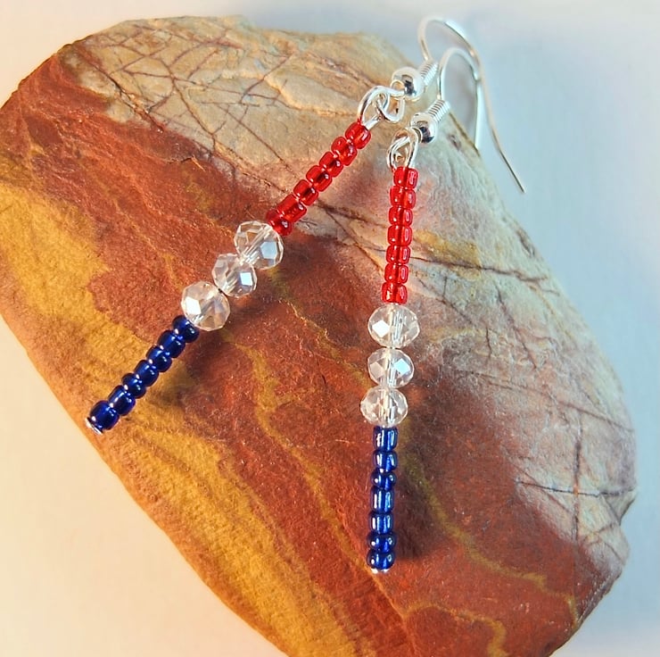 Tiny blue and red Czech glass seed beads are separated by 4mm sparkly faceted glass crystals and hung from silver plated ear-wires.