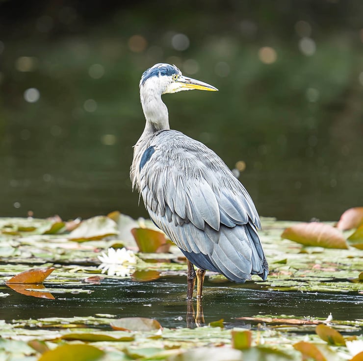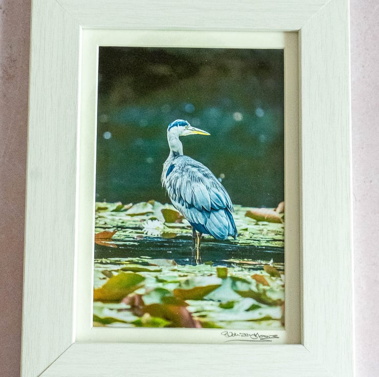Framed, original photograph of a Grey Heron standing in a pond full of water lilies. The photo was taken by myself on 29.08.21 in Bushy Royal Park, Hampton