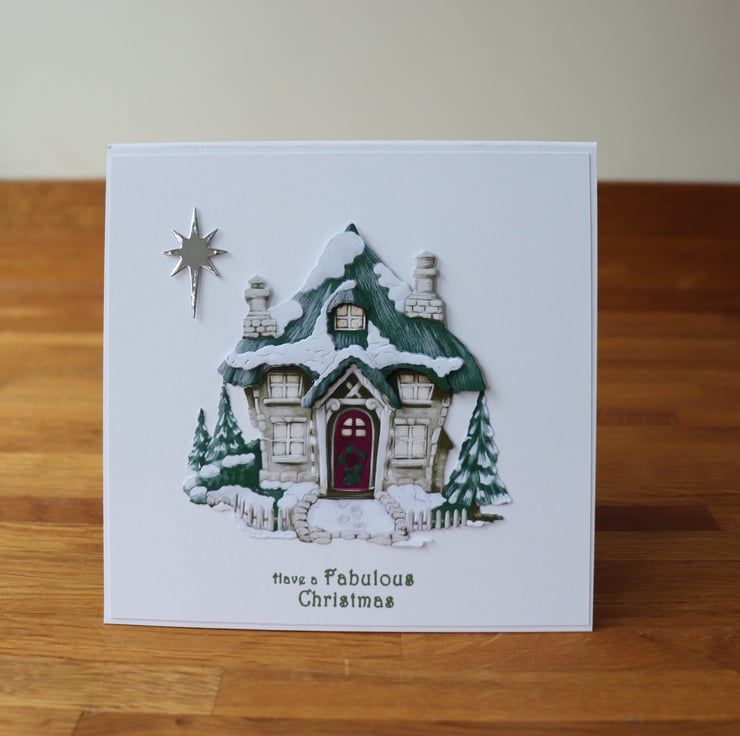The front of the card is a decoupage cottage at Christmas with a silver star, and the sentiment on the front is Have a fabulous Christmas, but inside is a cottage that pops up with trees and stars, I have inlaid parts of the cottage with the colours of Christmas.