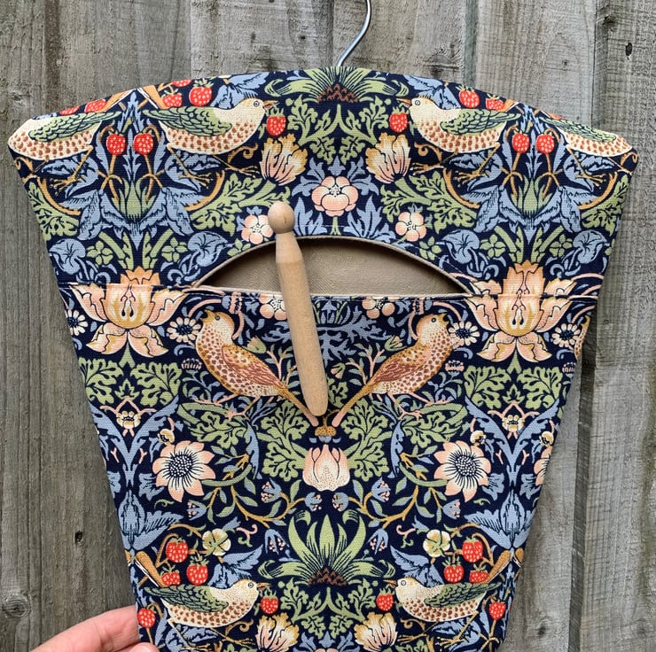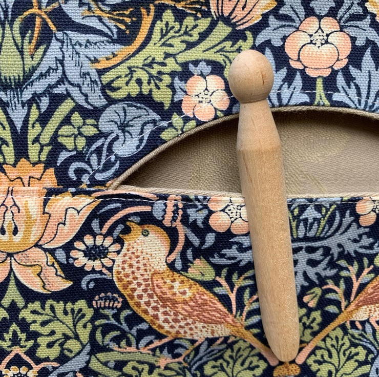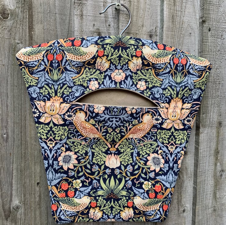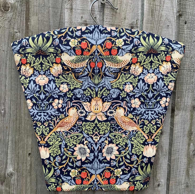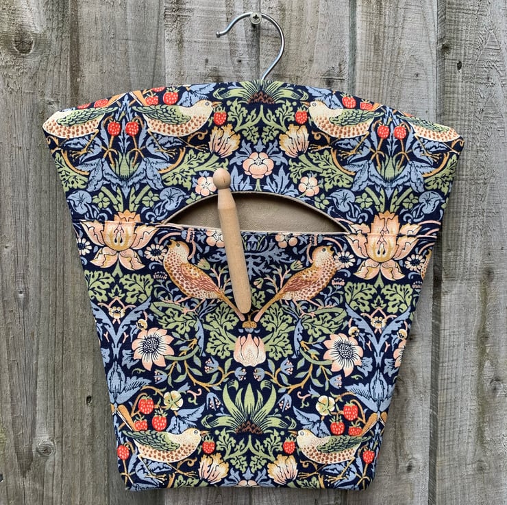 Peg bag made from pretty William Morris Strawberry Thief cotton on a dark blue background. Fully lined with thick beige damask fabric. It hangs from a strong wood and metal hanger.