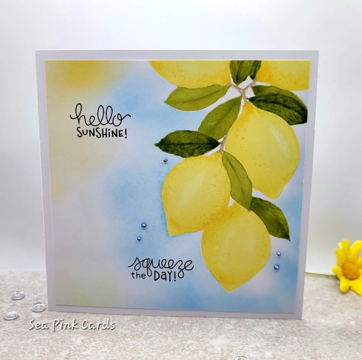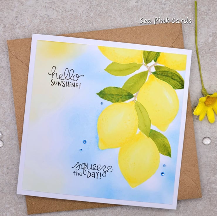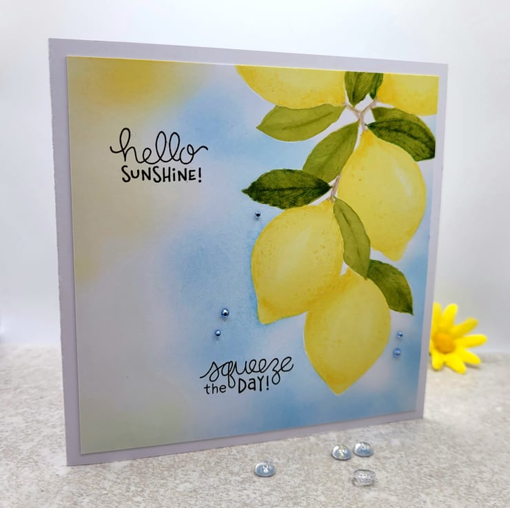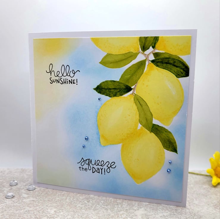 A birthday card with lemons and sunshine!. The card has been individually designed, stamped and coloured by hand. Handmade in my craft room to create a one-of-a-kind card. I have stamped the lemons with barely there ink and coloured with Artist Pro-Brush markers to achieve a seamless "no line colouring" finish. There are five tiny crystals used to decorate and a beautiful blue sky blended with archival ink. Hello Sunshine and Squeeze the Day are stamped in dark brown ink.