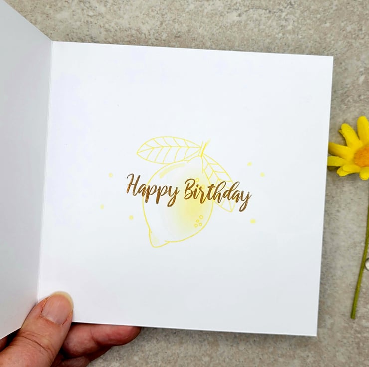 Measuring 14 x 14 cms, the card is made from 300 gsm smooth white card and the inside is decorated with a lemon image and "Happy Birthday".