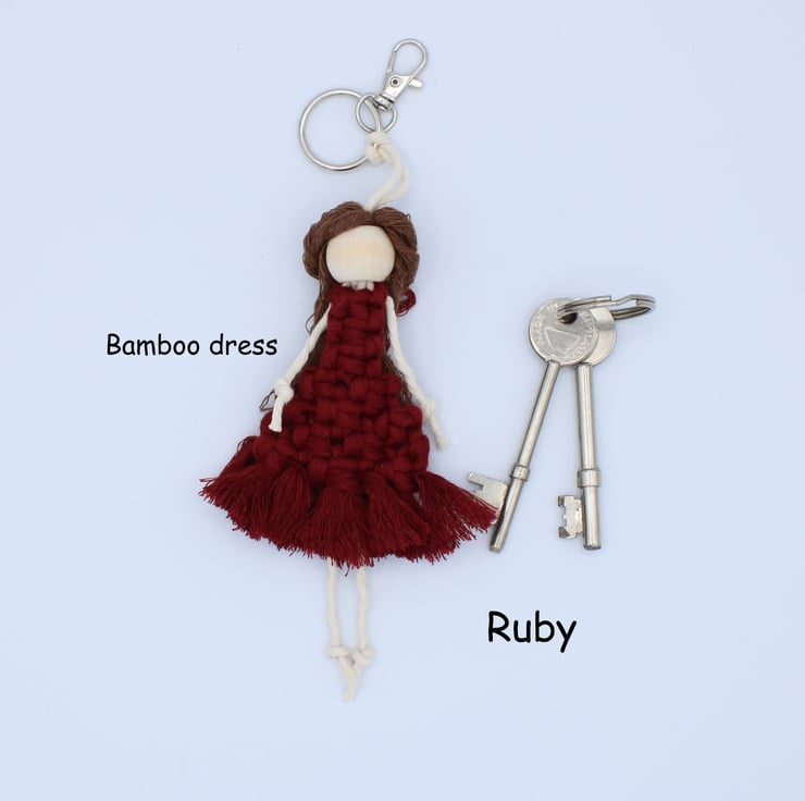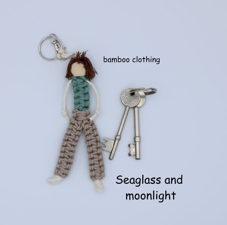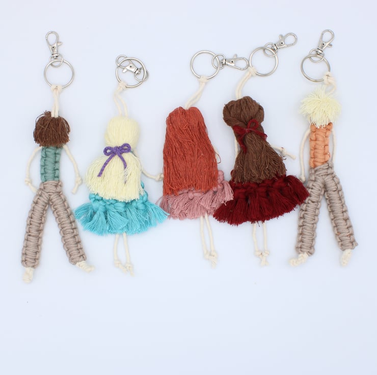 In this listing there is a selection of little macrame people keyrings handmade from recycled cotton and bamboo string. I have used wooden beads for their heads.