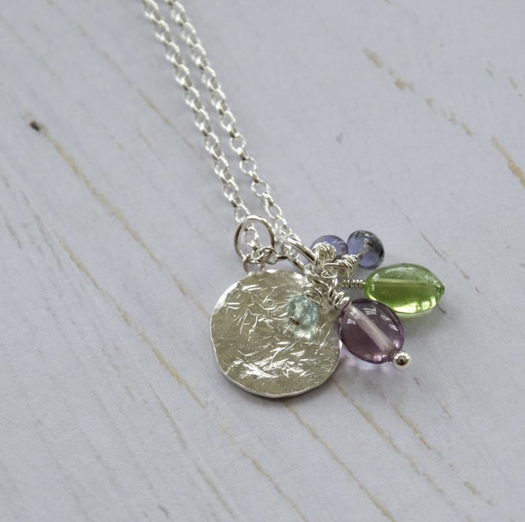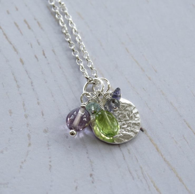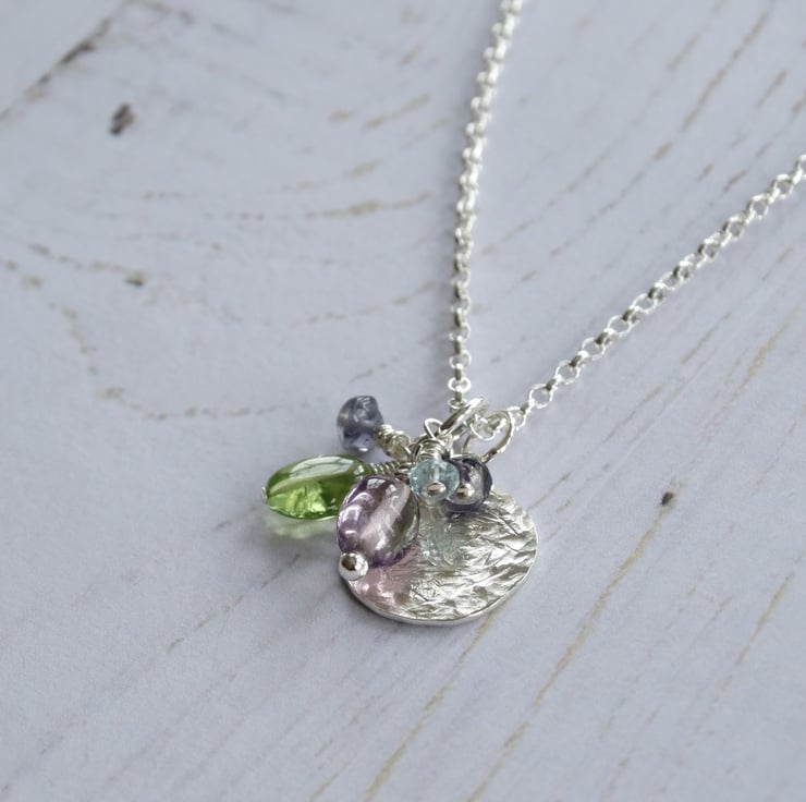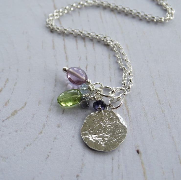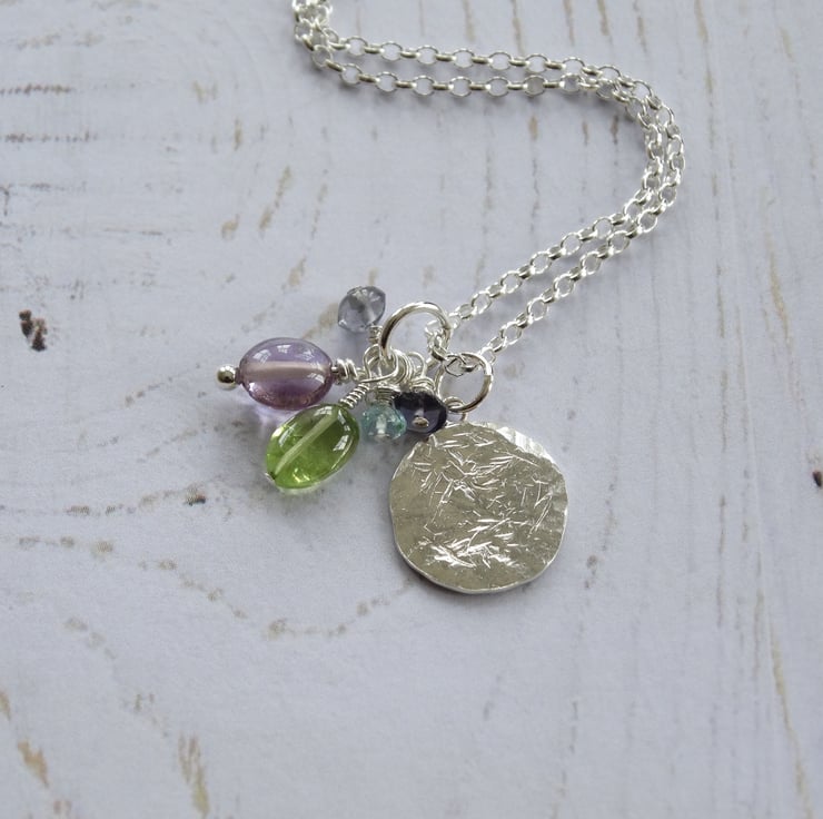 This delicate little disc pendant has been hand-pierced from sterling silver sheet before being textured all over to give it a lovely weathered appearance. It has been filed, sanded and polished by hand to give the silver a lovely glow. It hangs with a little cluster of gemstone beads suspended on sterling silver wires: a lilac amethyst pebble, a peridot pebble, two tiny iolite beads, and a tiny faceted aquamarine.