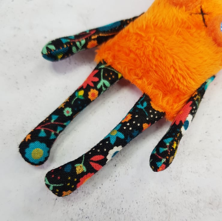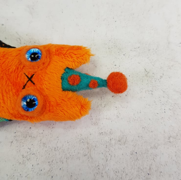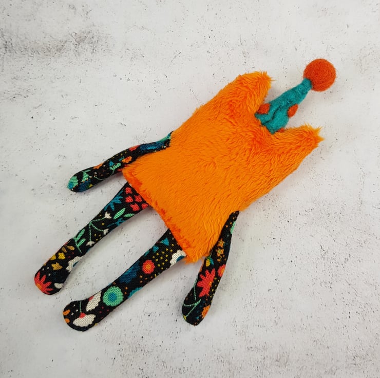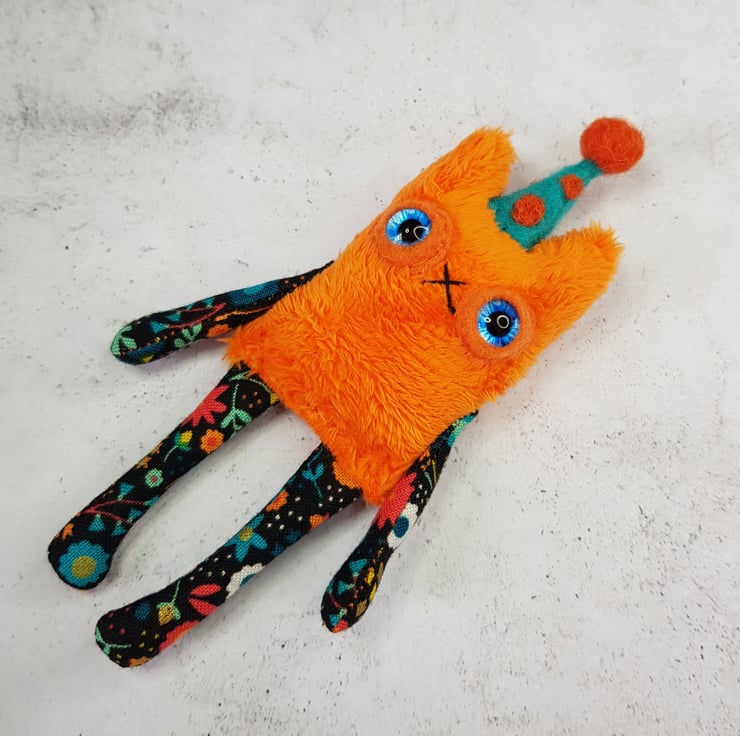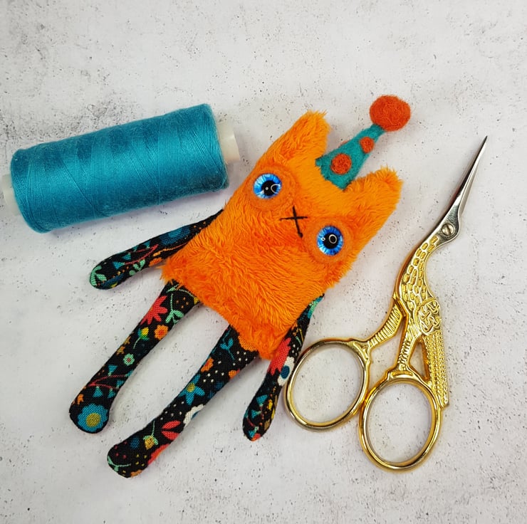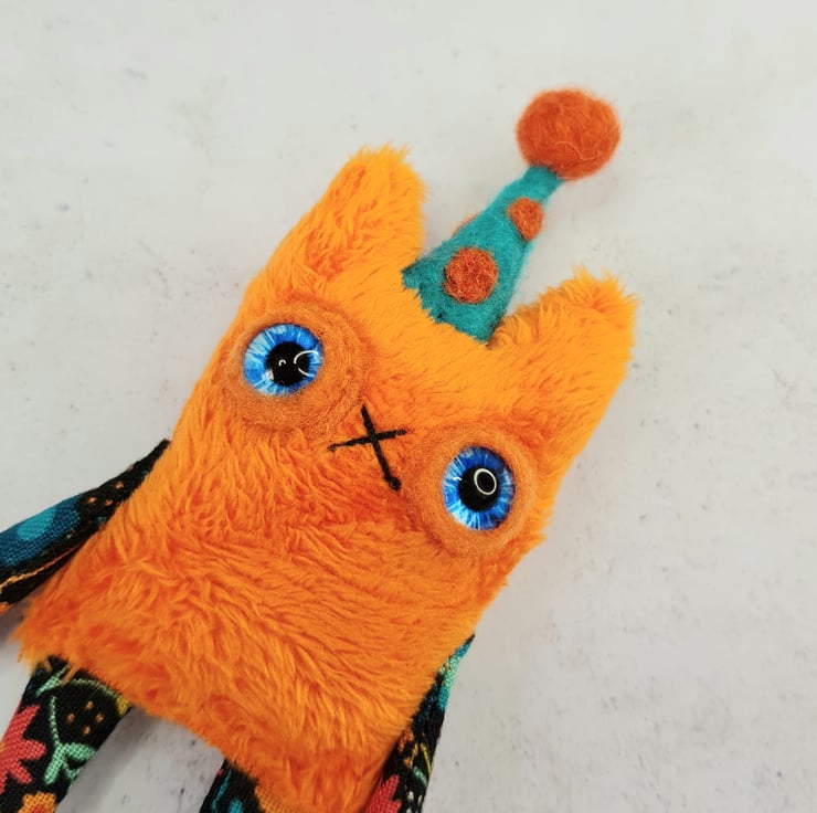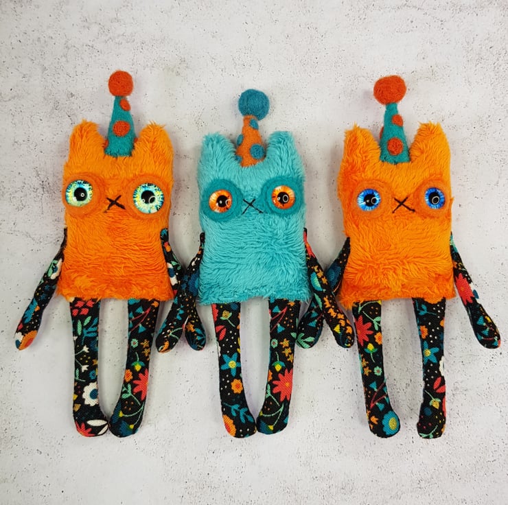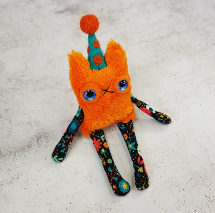 This little cat is made from soft plush fabric with contrasting cotton arms and legs. It has a hand embroidered nose and mouth with glass eyes set in felt and a needle felted polka dot party hat sewn into place. These cats measure at a dinky 12cm tall. If you'd like a transparent thread hanger attached just choose from the option provided. This is a decorative piece and not a toy. Sent beautifully wrapped in recyclable packaging. Listing is for one cat.