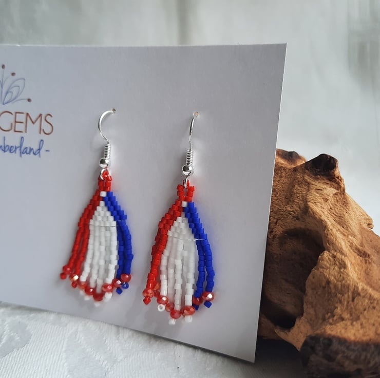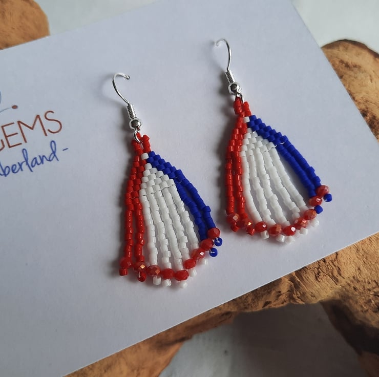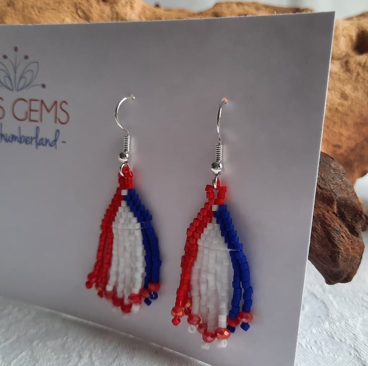 A pair of light weight beadwork earrings made using Japanese Delica beads in the colours red, white and blue. They are approx. 3.5cm from the base of the ear wire and approx. 2.4cm at their widest point. Each tassel has a tiny little red faceted crystal button bead with a rainbow affect at each end. The tassels can be turned round to represent the French flag, just let me know prior to sending. The ear wires are silver plated but sterling silver are available as an option at checkout too.