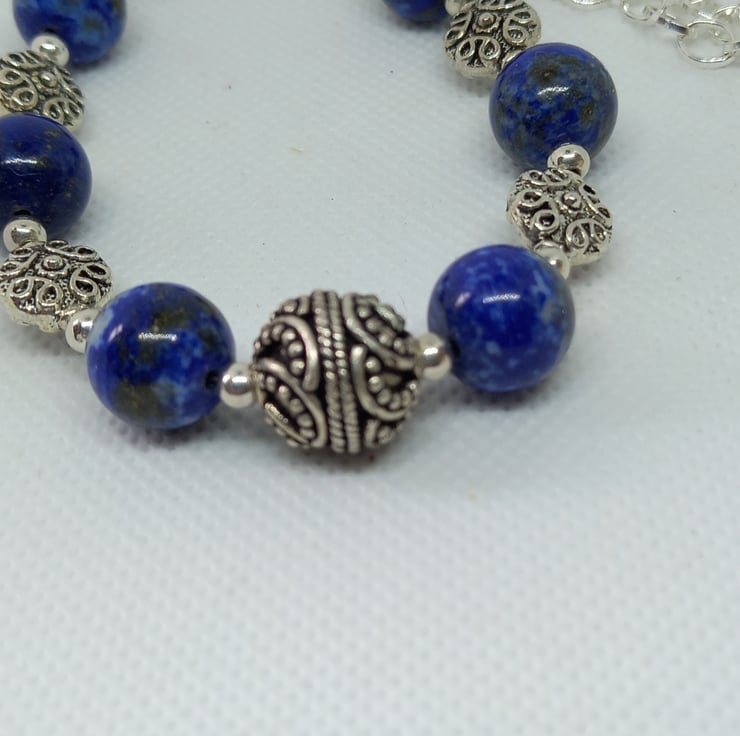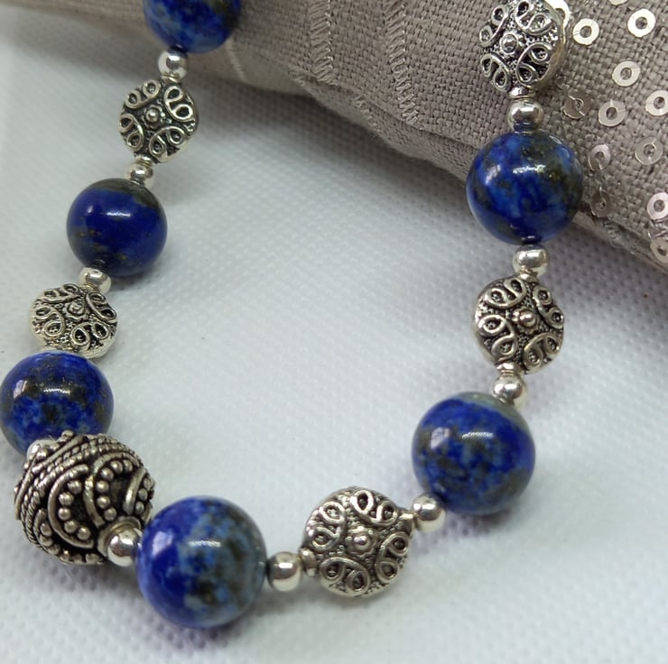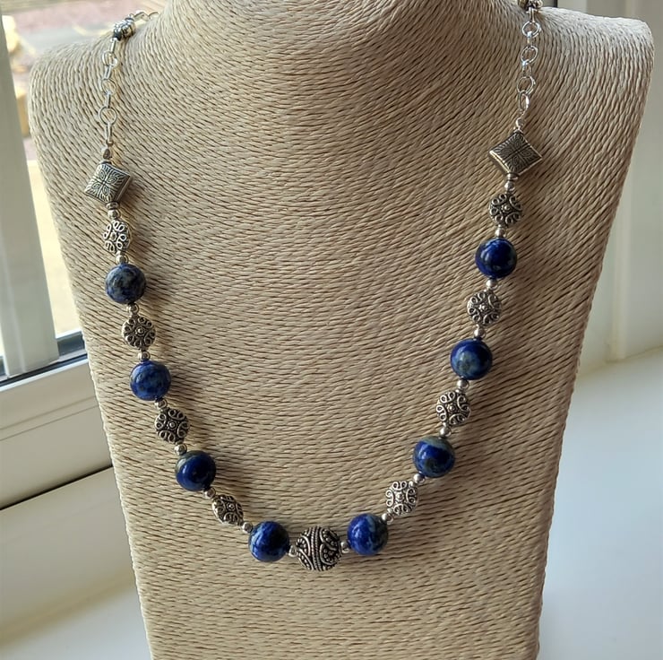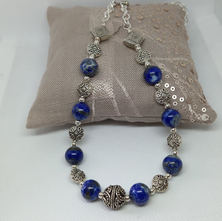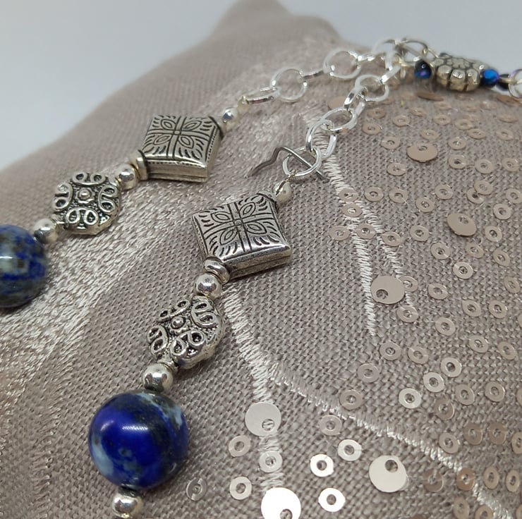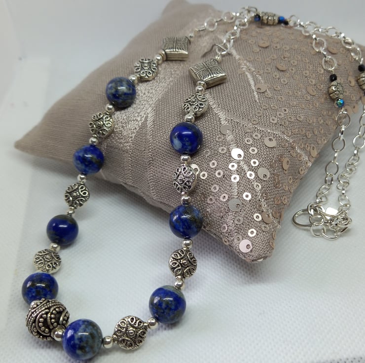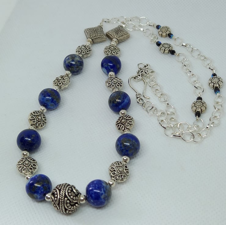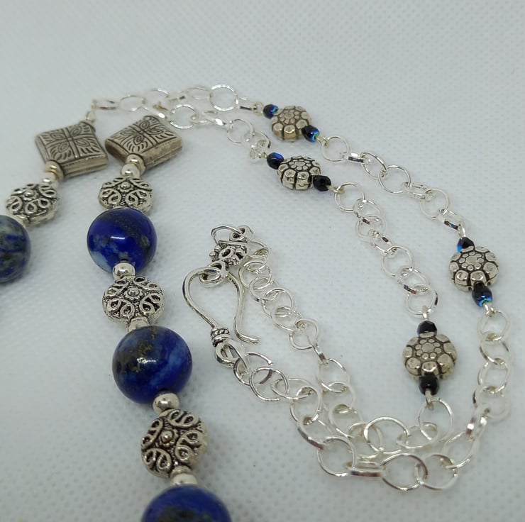 A stunning long necklace featuring 12mm lapis lazuli beads, teamed with large tibetan silver beads in round and diamond shapes and with a beautifully textured large tibetan silver bead in the centre. There are also small silver tone beads and a substantial silver plated chain, accented by connectors made from tibetan silver and fire polished crystals. Fastens with a simple hook. An elegant necklace for all occasions.