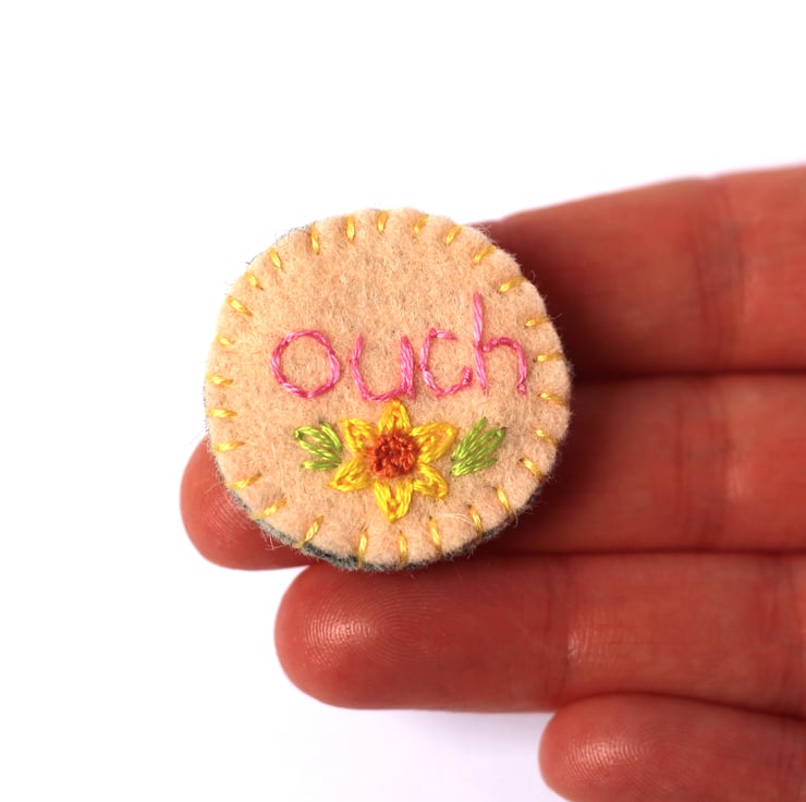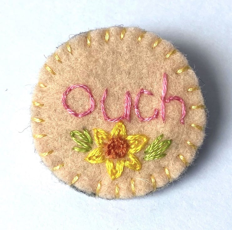 Ouch! This little and round brooch makes a statement. The word ouch has been embroidered onto pale peach wool felt in pink with a daffodil motif stitched underneath. The idea behind this is to provide a subtle but still very pretty way to let those close to you know how you might be feeling without having to explain everything if you don't want to. If you live with chronic pain, fibromyalgia or mental or emotional pain then some days you might not want to talk about it but still need those around you to know that you're having a difficult day. This little badge will let them know that you need very gentle hugs, a little bit more rest or an extra cup of tea without you saying a word.