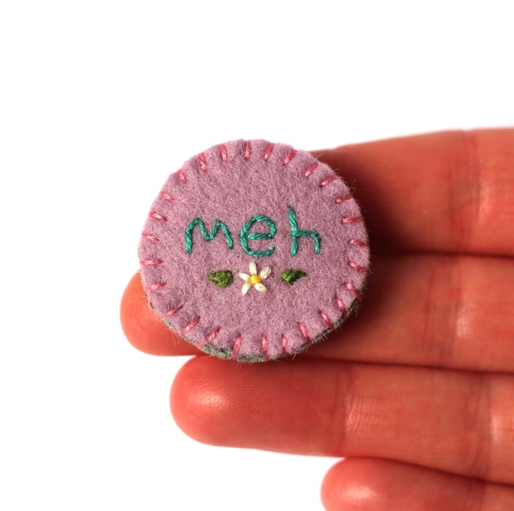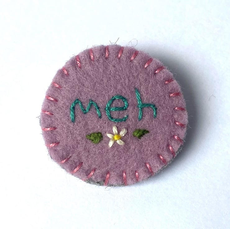 A brooch that makes a statement! This time the statement is 'meh'. Meh has been embroidered in blue on a light purple wool felt background and has a pretty white daisy and two leaves underneath. The stitched design has been securely attached to thick wool felt with pink thread in my signature style and is very sturdy. The brooch has a standard metal brooch back to pin onto whatever you choose. Hats are my favourite place to pin these but your top or a handbag would be great too.