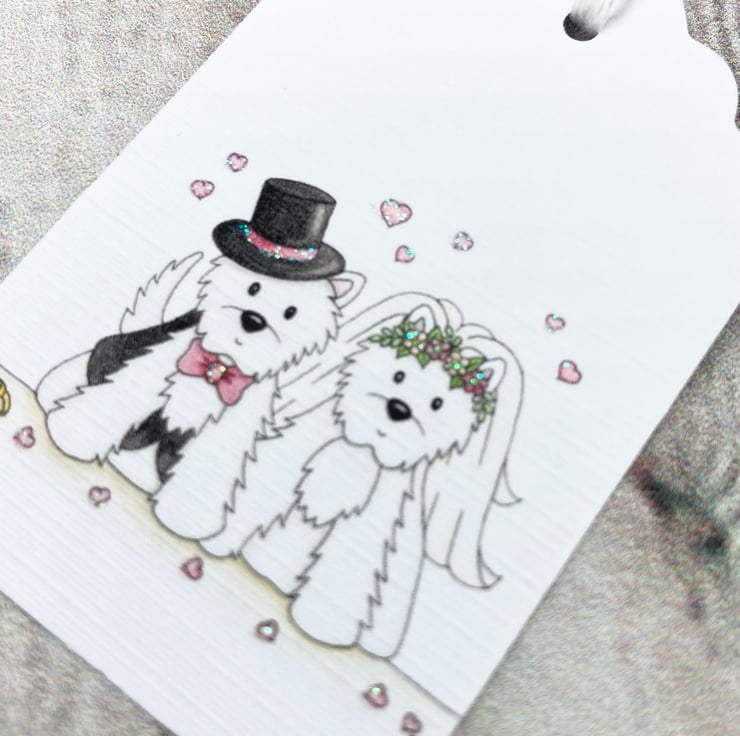 These cute Westie Wedding gift tags have been designed using my own original watercolour illustration. I have designed them to match and compliment my handmade cards in the same design.