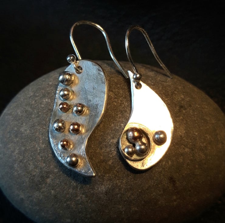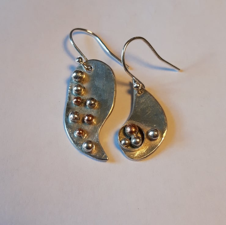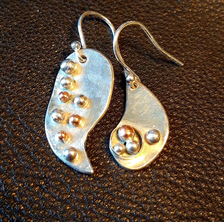 these 'twins' have been cut from the same piece of silver to form a set of matching but slightly different dangly earrings. They are made from silver and feature a few tiny copper balls. The largest of the two earrings is approx 2.5cm long.