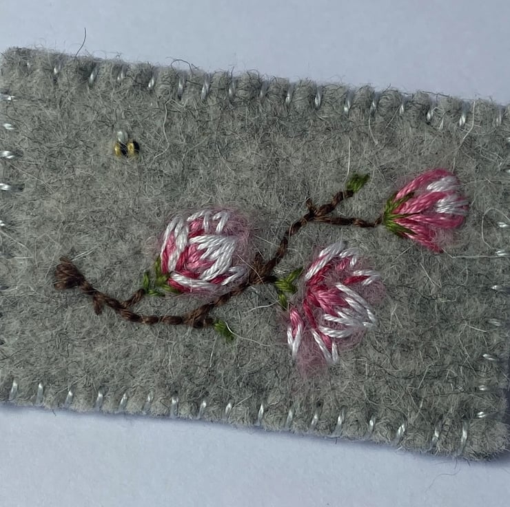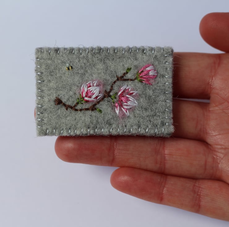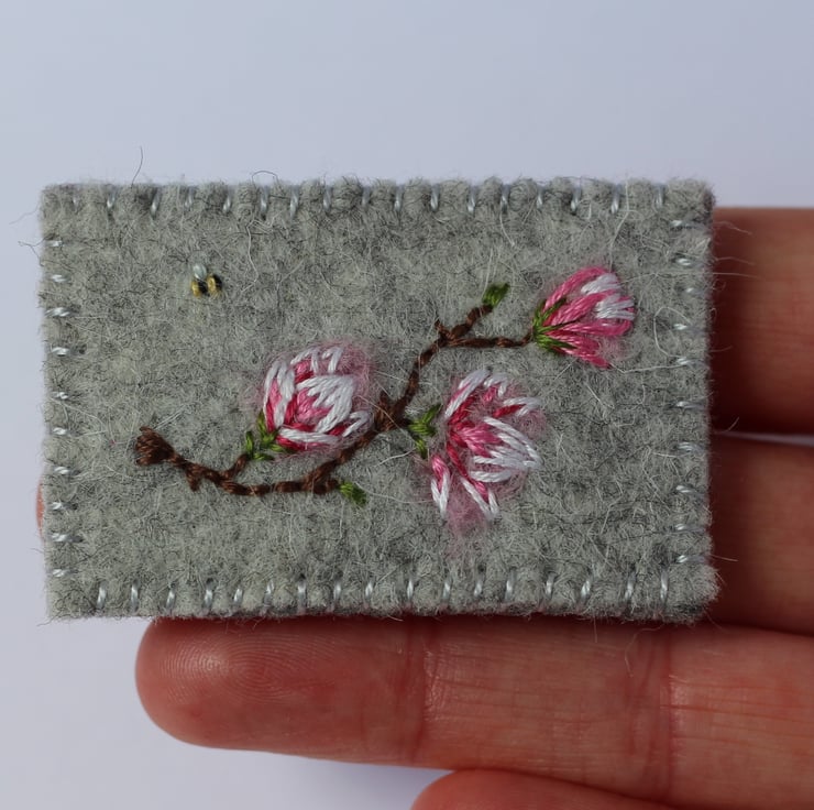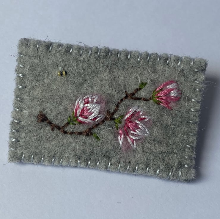 A branch of beautiful magnolia flowers have been needle felted and embroidered onto a light grey wool felt background. The blossom have been needle felted in a light pink then stitched in white and two shades of pink to bring out the petals of each of the three flowers. Each bloom is at a different stage of opening to mimic life. Some small green flourishes can be seen on the branch and around the magnolia to highlight the birth of a new set of leaves. A tiny bee is buzzing over on the left side of the design. This brooch encapsulates spring. It is one of a kind too so you know you will be wearing something that is unique.