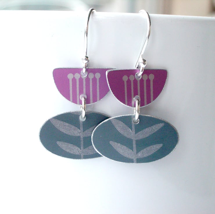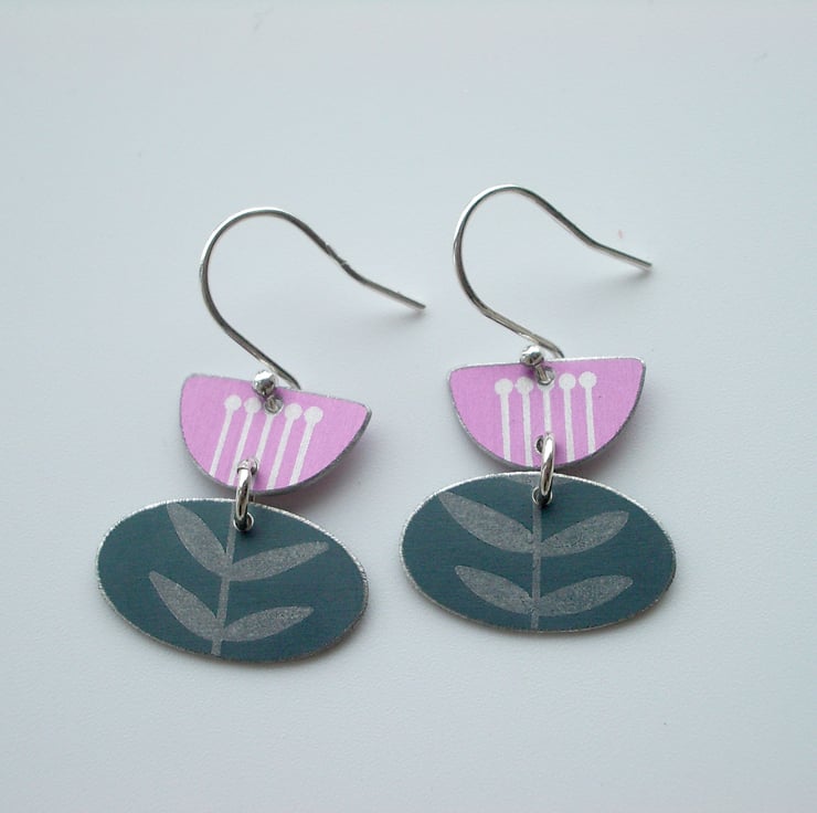 These pink flower earrings are inspired by scandi style folk art and are made from anodised aluminium which I have dyed in grey and pink and printed with a leaf print. The dye is made permanent by heating the aluminium. I have cut out the circle and pod shape with a piercing saw and filed the edges for a nice smooth finish. The two pieces are linked with a sterling silver hoop and dangle from a sterling silver ear wire. The circle and pod shape together both measure approximately 25mm from top to bottom and the widest part of the pod measures 20mm across.