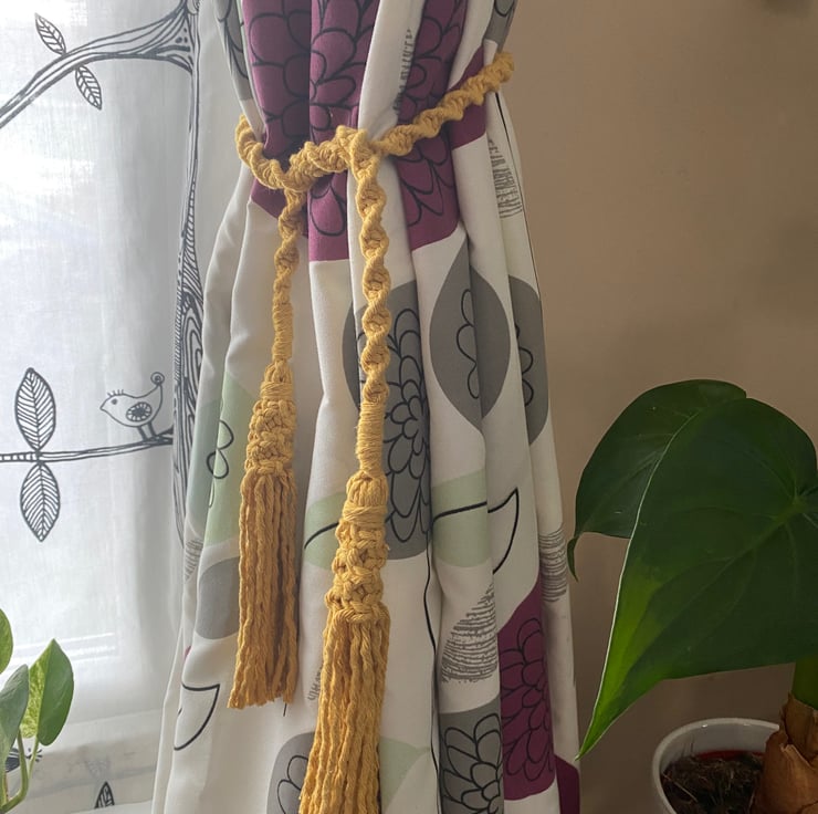 Mustard macrame tie back for curtains, curtain tiebacks, curtain holdback, curtain ties, lounge decor, modern farmhouse, drapery holdback