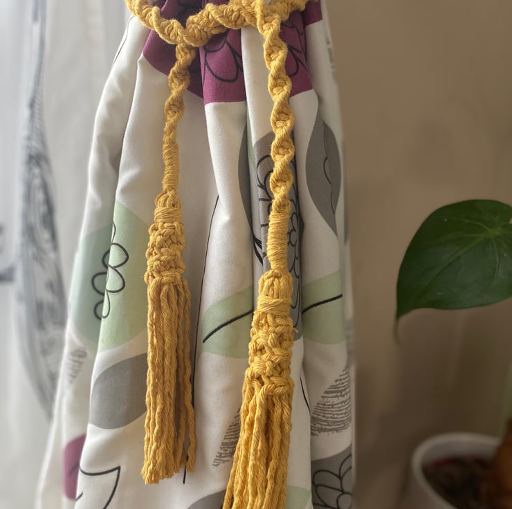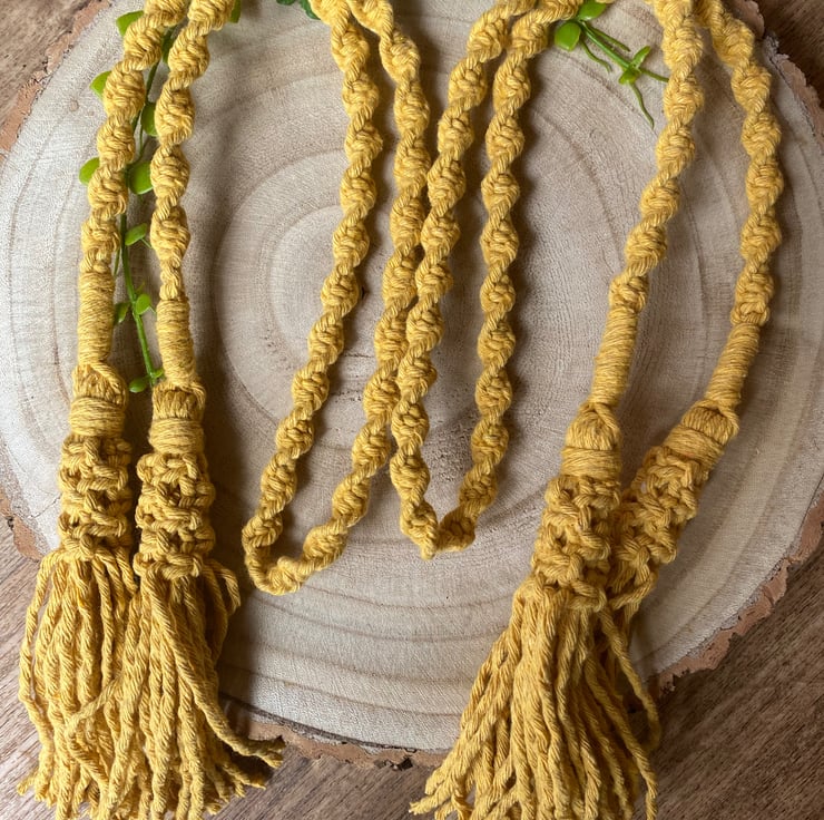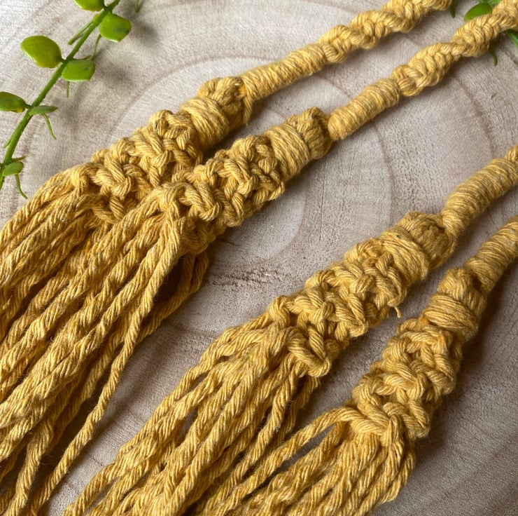 A PAIR of macrame curtain tie backs, made with honey yellow recycled cotton cord.