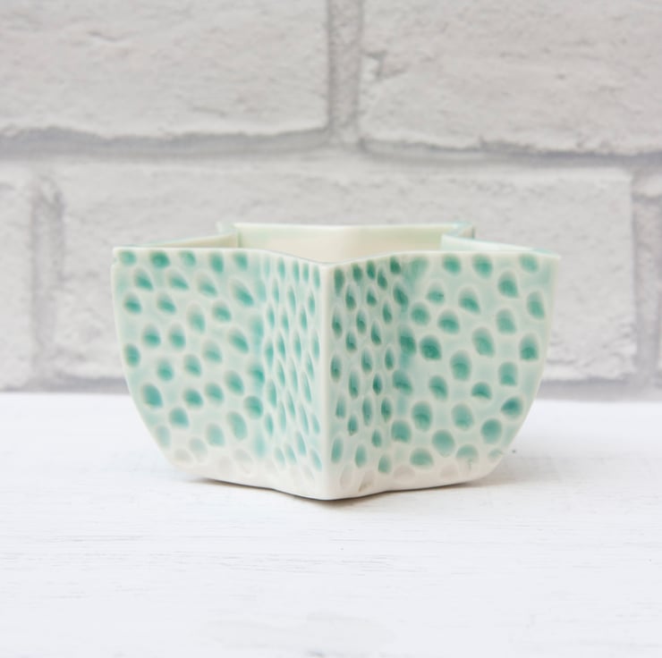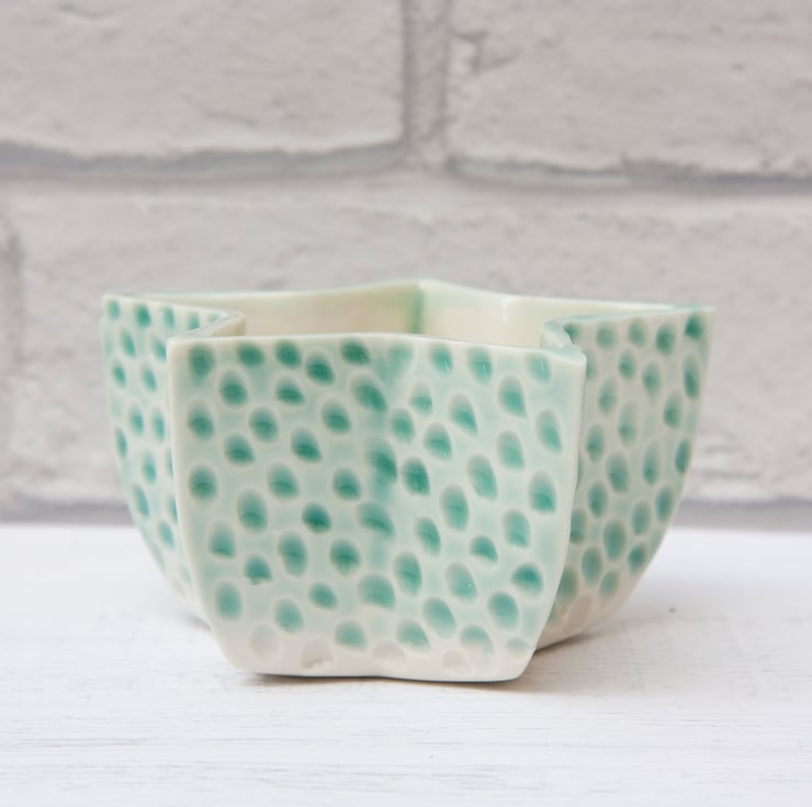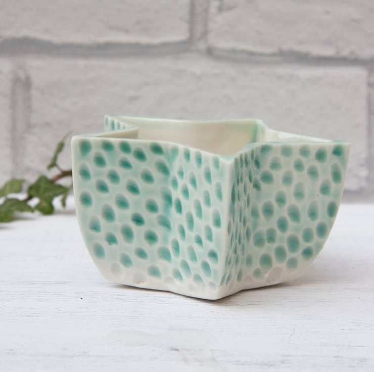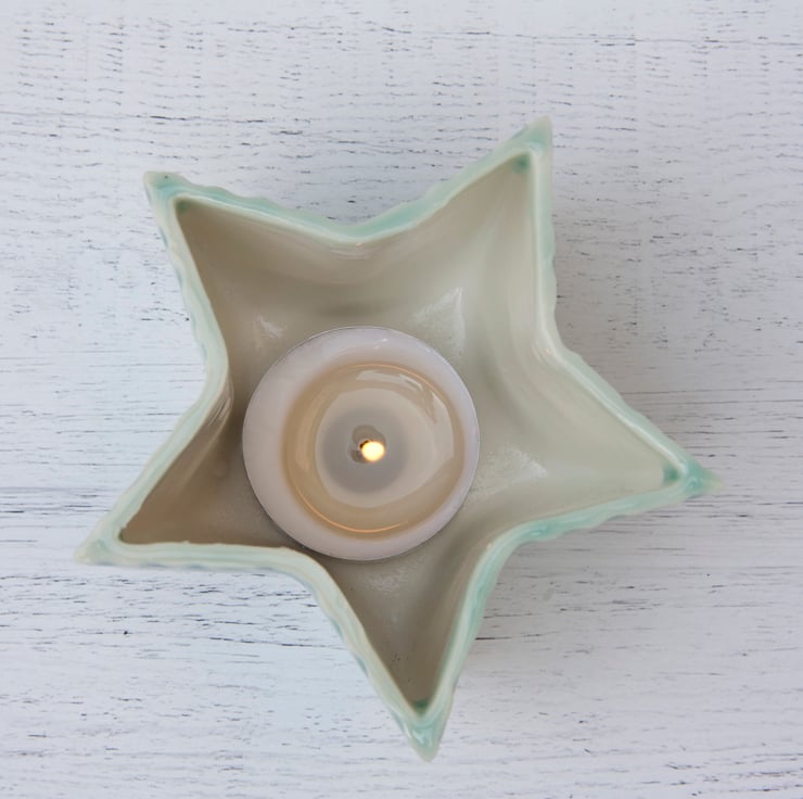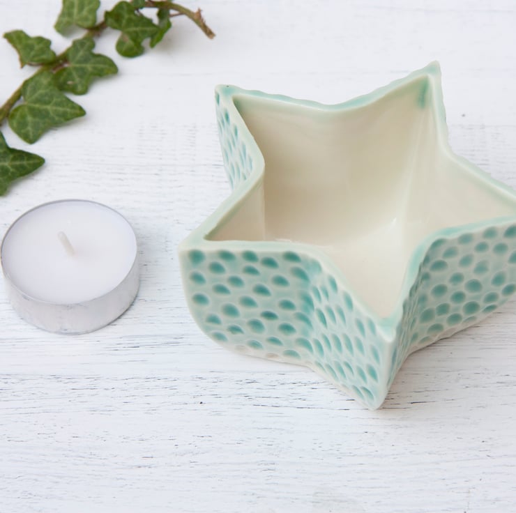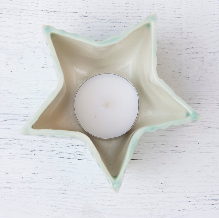 This is a larger version of my star tealight holder. It is 10.5cms at the widest points and 6cms high. Its glazed inside and out with a clear glaze.