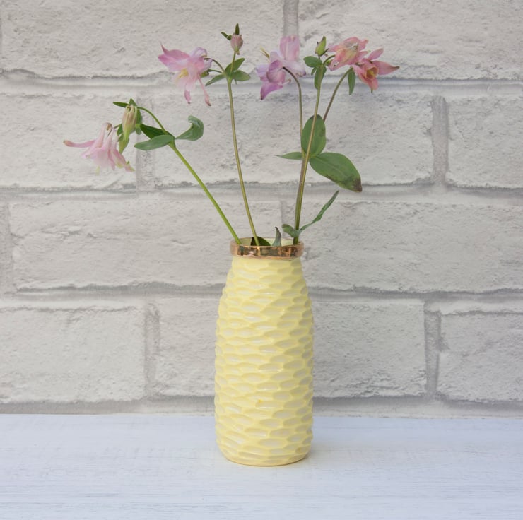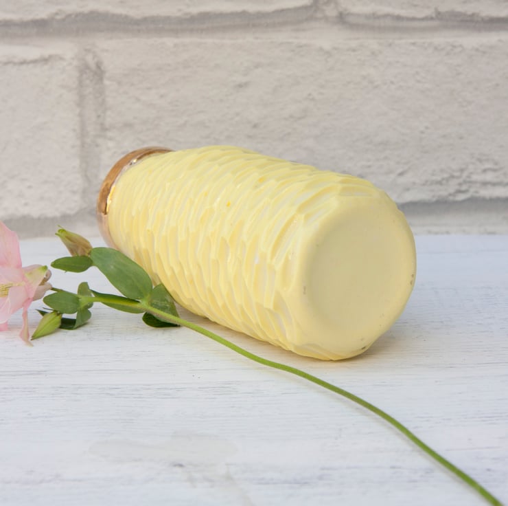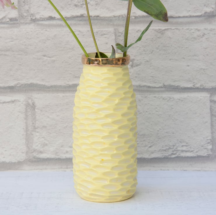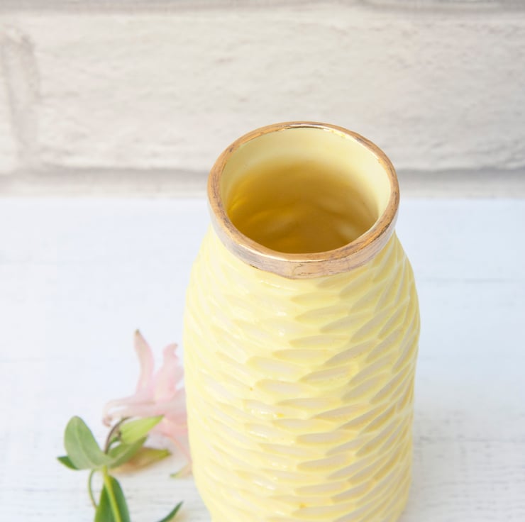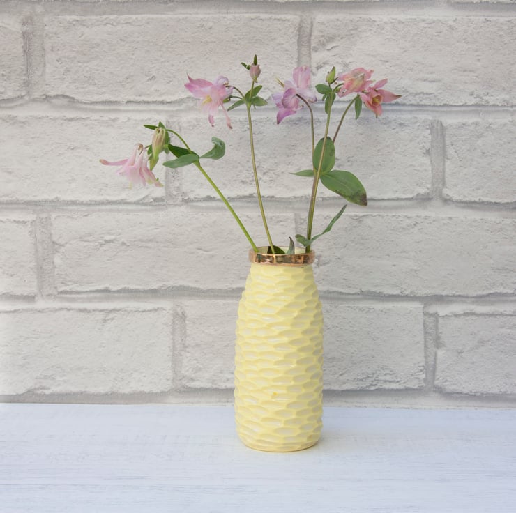 The porcelain is stained with lemon yellow and carved with texture. All the vases are glazed on the inside to make them easier to keep clean.