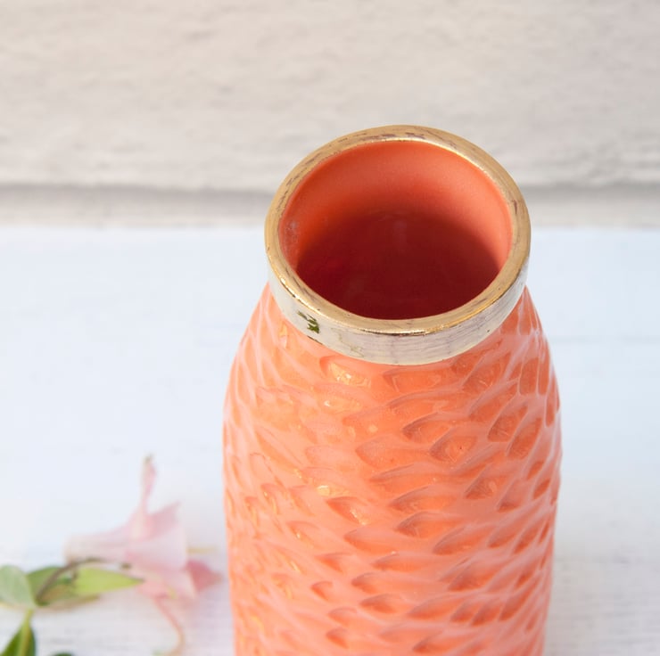 The porcelain is stained with orange pigment and carved with texture. All the vases are glazed on the inside to make them easier to keep clean.