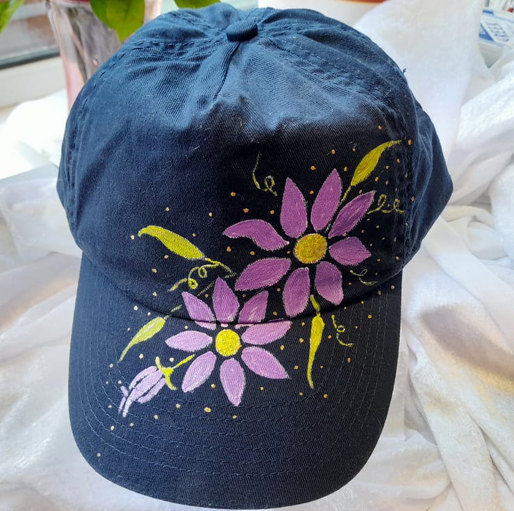 Hand painted baseball cap with a clematis design. 100% cotton.
