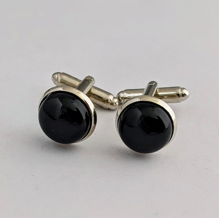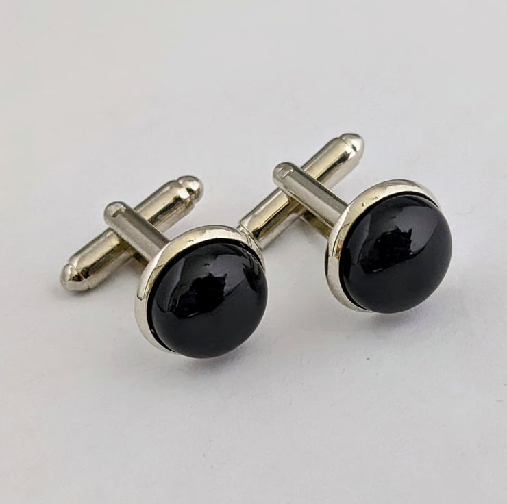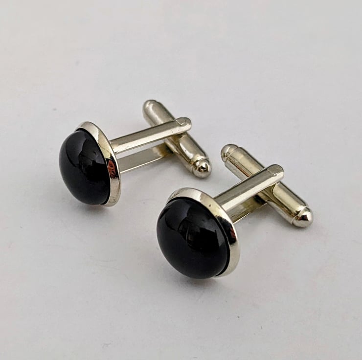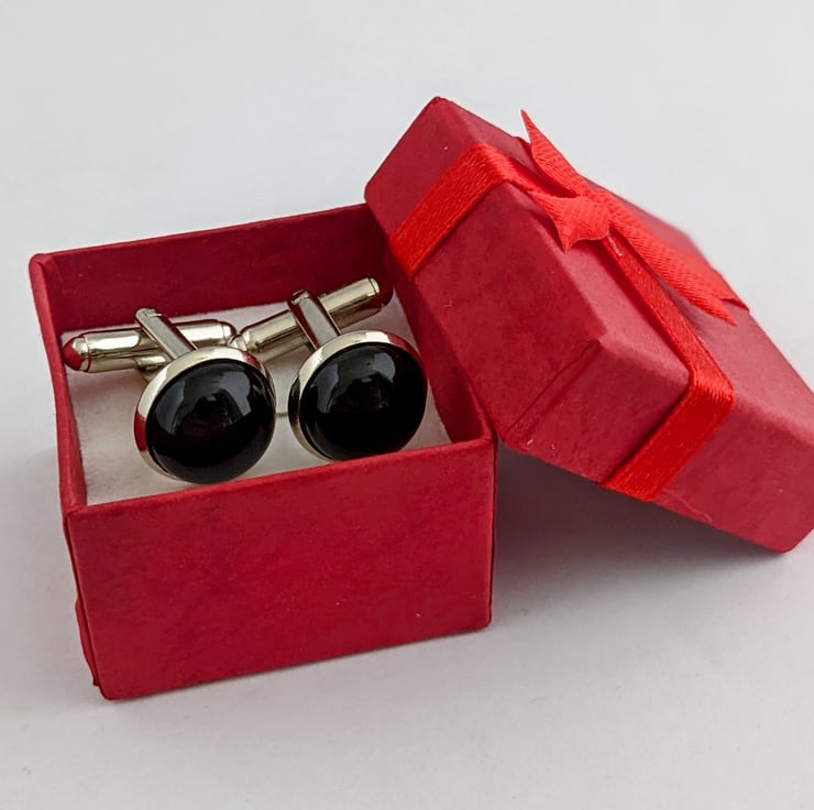 25mm black onyx cabochons in silver plated cufflink settings. Presented in a red gift box.